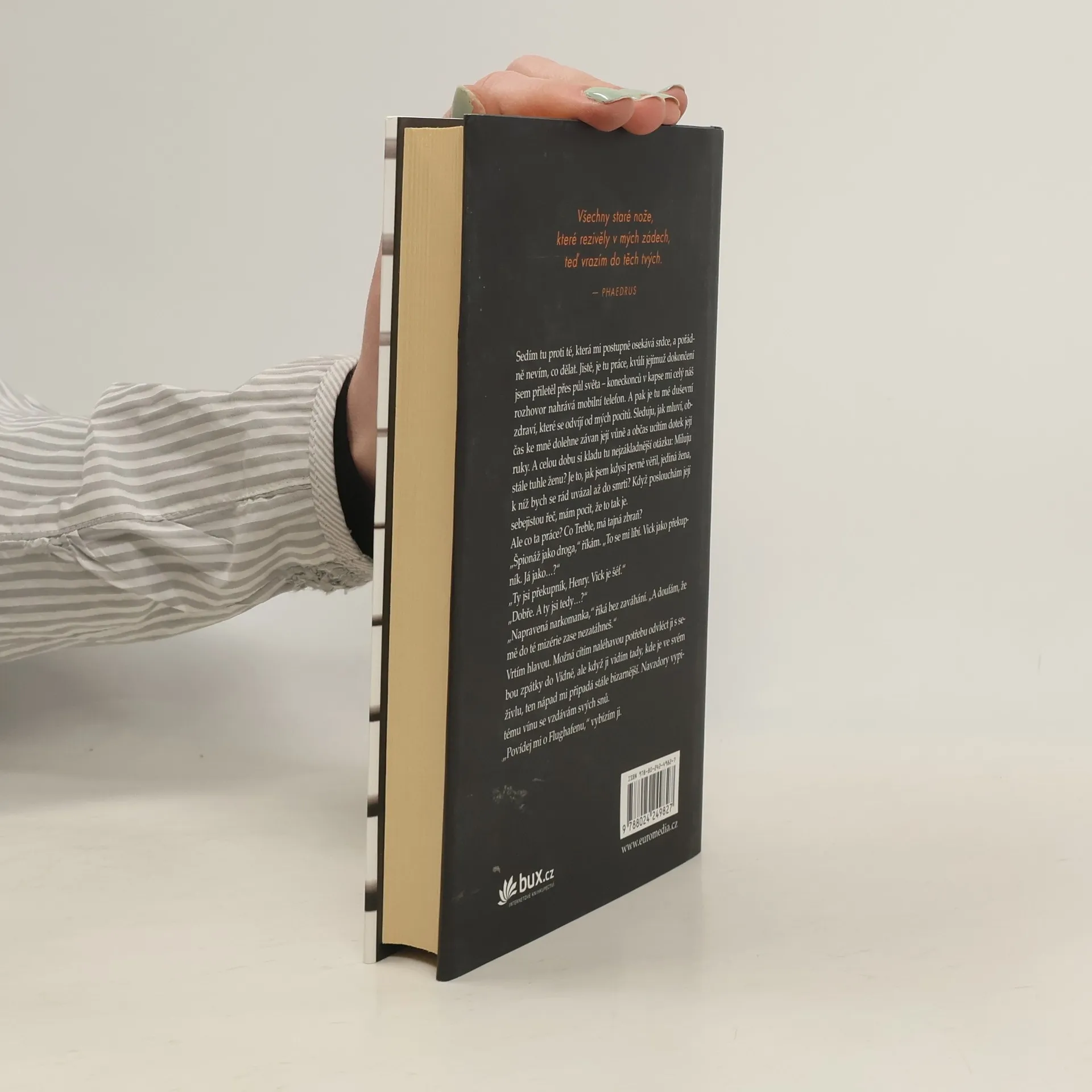 Všechny staré nože, které rezivěly v mých zádech, teď vrazím do těch tvých. – Phaedrus Může se špionážní příběh plný akce a šokujících zvratů odehrát během jediného poklidného rozhovoru dvou lidí u večeře v restauraci na idylickém kalifornském pobřeží? Může – pokud ho napíše mistr tohoto žánru, autor celosvětového bestselleru Turista Olen Steinhauer. Před několika lety čelila Vídeň teroristickému útoku s tragickými následky. Místní pracoviště CIA se jim snažilo zabránit – díky souhře náhod získalo klíčové informace, jejich zdroj však někdo prozradil. A nikdo kromě místních agentů o něm nevěděl… Dva z nich, Henry Pelham a Celia Harrisonová, spolu až do oné osudné noci pracovali i žili. Teď má Celia rodinu s někým jiným, odešla ze CIA a zabydlela se daleko od své minulosti. Henry zůstal sám ve Vídni, ale myšlenky na minulost ho neopustily – proto se jednoho dne vydá za Celií. Bývalí milenci a špičkoví agenti, zvyklí nepřiznat pravdu a nikomu nedůvěřovat, se sejdou, aby si vyjasnili, co se tenkrát stalo…