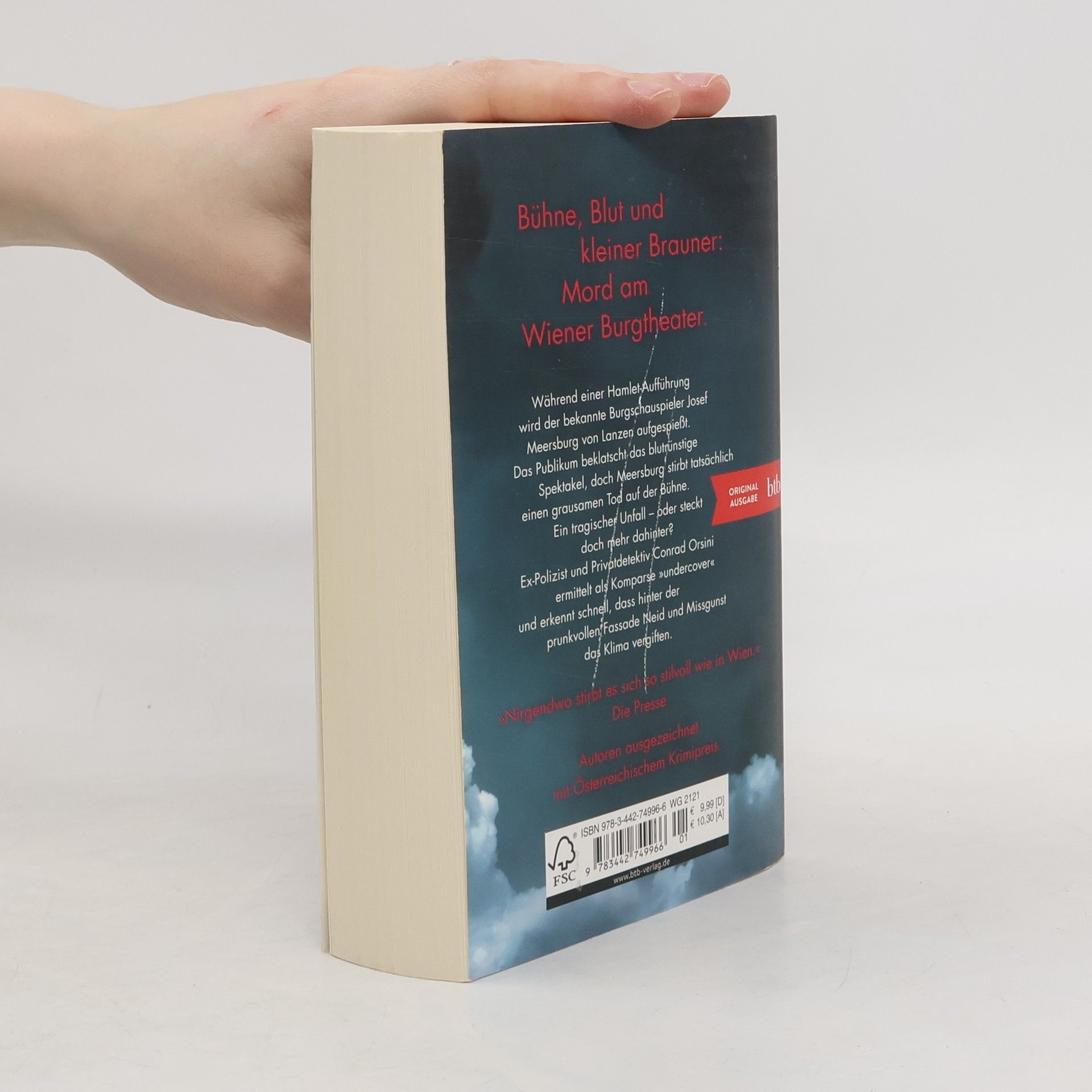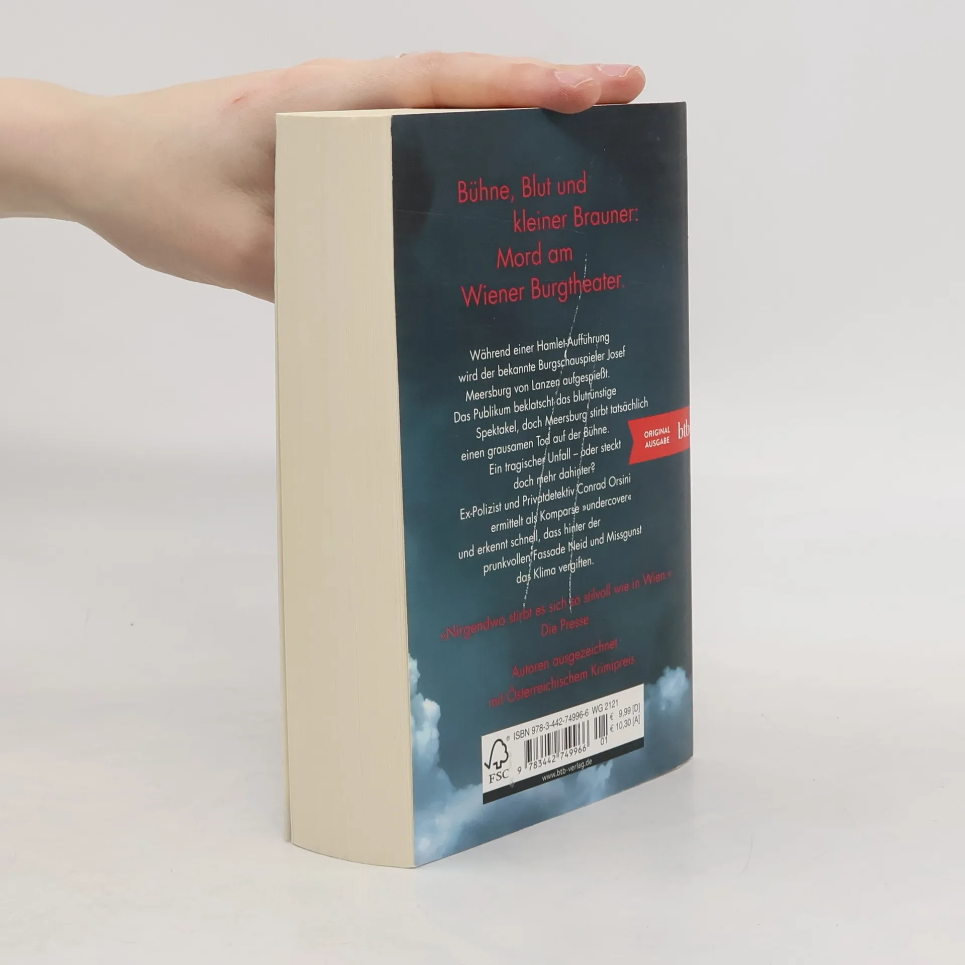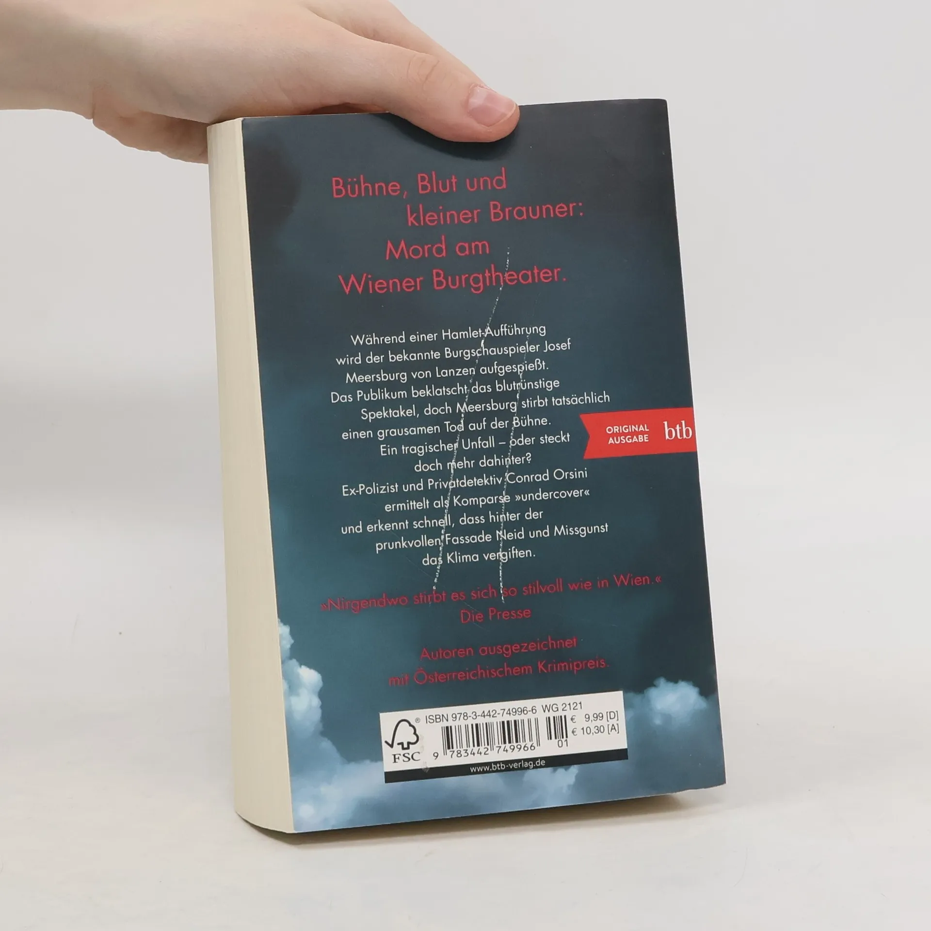 Bühne, Blut und kleiner Brauner: Mord am Wiener Burgtheater. Wien in der Weihnachtszeit: Am Burgtheater wird eine modernistische Hamlet-Inszenierung gegeben. Als der Claudius-Darsteller blutüberströmt von Lanzen aufgespießt wird, klatscht das Publikum Beifall, doch der bekannte Burgschauspieler Meersburg stirbt tatsächlich einen grausamen Tod auf der Bühne. Nach einer kurzen Untersuchung durch die Behörden wird verkündet, dass er Opfer eines tragischen Unfalls wurde. Paula Kisch von der Wiener Kripo hat allerdings ihre Zweifel und bittet ihren Ex-Kollegen, Privatdetektiv Conrad Orsini, zu ermitteln. Als Komparse »undercover« eingeschleust, erkennt Orsini schnell: Neid und Missgunst vergiften das Klima auf allen Ebenen, vom Bühnenarbeiter bis zum Direktorium. Und dann gibt es einen zweiten Toten.