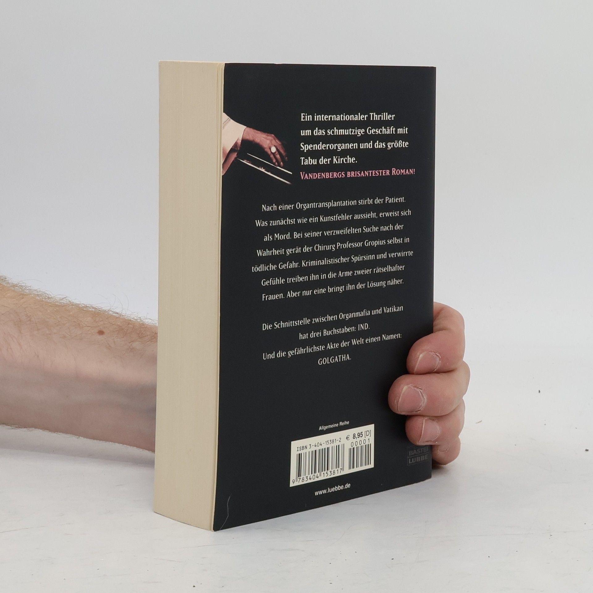 Nach einer Organtransplantation stirbt der Patient. Was zunächst wie ein Kunstfehler aussieht, erweist sich als Mord. Bei seiner verzweifelten Suche nach der Wahrheit gerät der Chirurg Professor Gropius selbst in tödliche Gefahr. Kriminalistischer Spürsinn und verwirrte Gefühle treiben ihn in die Arme zweier rätselhafter Frauen. Aber nur eine bringt ihn der Lösung näher. Die Schnittstelle zwischen Organmafia und Vatikan hat drei Buchstaben: IND. Und die gefährlichste Akte der Welt einen Namen: Golgatha.