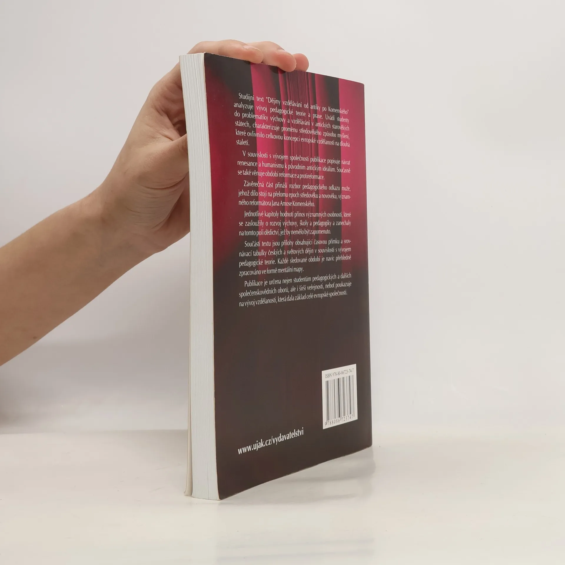 Studijní text Dějiny vzdělávání od antiky po Komenského analyzuje vývoj pedagogické teorie a praxe. Uvádí studenty do problematiky výchovy a vzdělávání v antických starověkých státech, charakterizuje proměnu středověkého způsobu myšlení, které ovlivnilo celkovou koncepci evropské vzdělanosti na dlouhá staletí. V souvislosti s vývojem společnosti publikace popisuje návrat renesance a humanismu k původním antickým ideálům. Současně se také věnuje období reformace a protireformace. Závěrečná část přináší rozbor pedagogického odkazu muže, jehož dílo stojí na přelomu epoch středověku a novověku, významného reformátora Jana Amose Komenského.