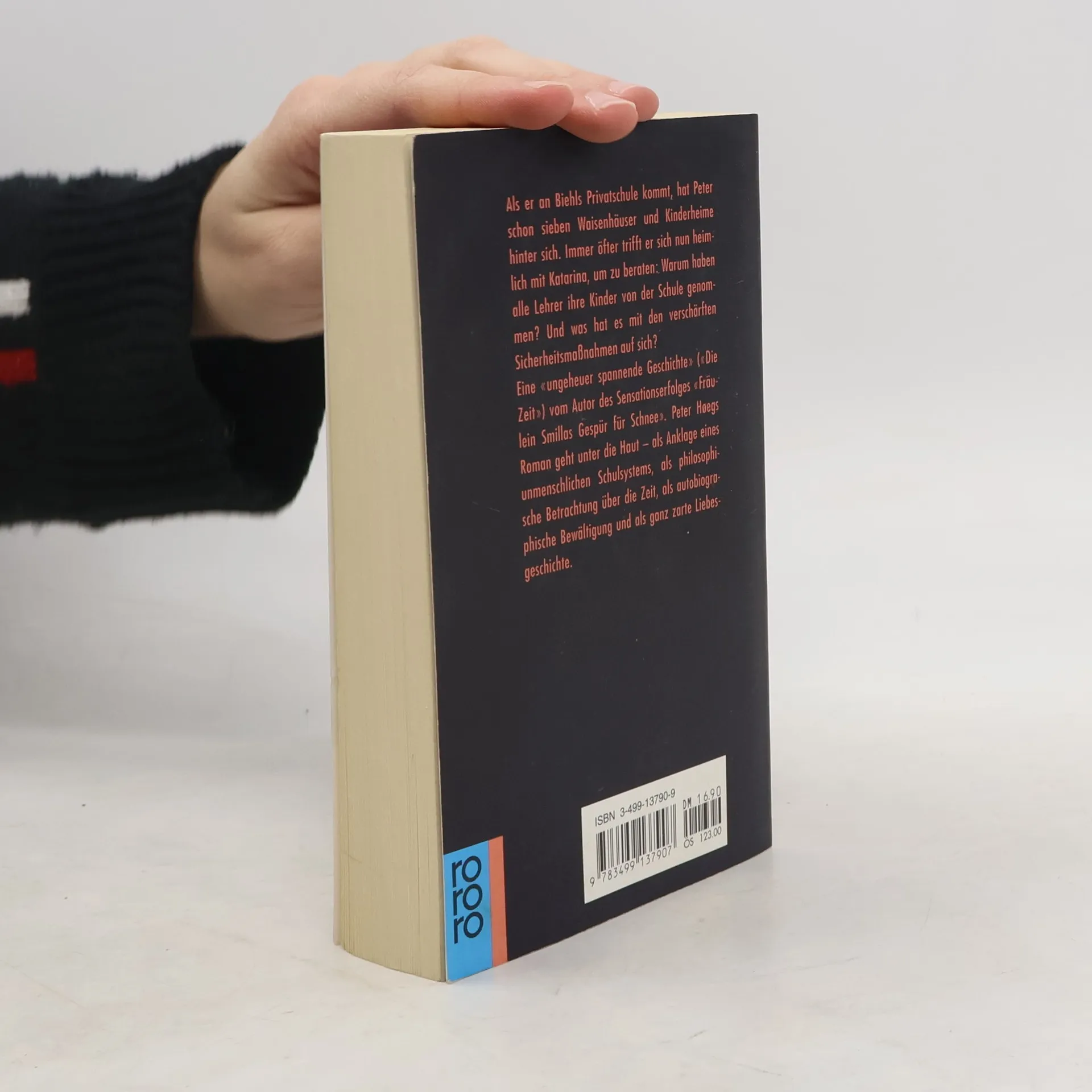 Als er an Biehls Privatschule kommt, hat Peter schon sieben Waisenhäuser und Kinderheime hinter sich. Immer öfter trifft er sich nun heimlich mit Katarina, um zu beraten: Warum haben alle Lehrer ihre Kinder von der Schule genommen ? Und was hat es mit den verschärften Sicherheitsmaßnahmen auf sich? Peter Hoegs Roman geht unter die Haut - als Anklage eines unmenschlichen Schulsystems, als philosophische Betrachtung über die Zeit, als autobiographische Bewältigung und als ganz zarte Liebesgeschichte.