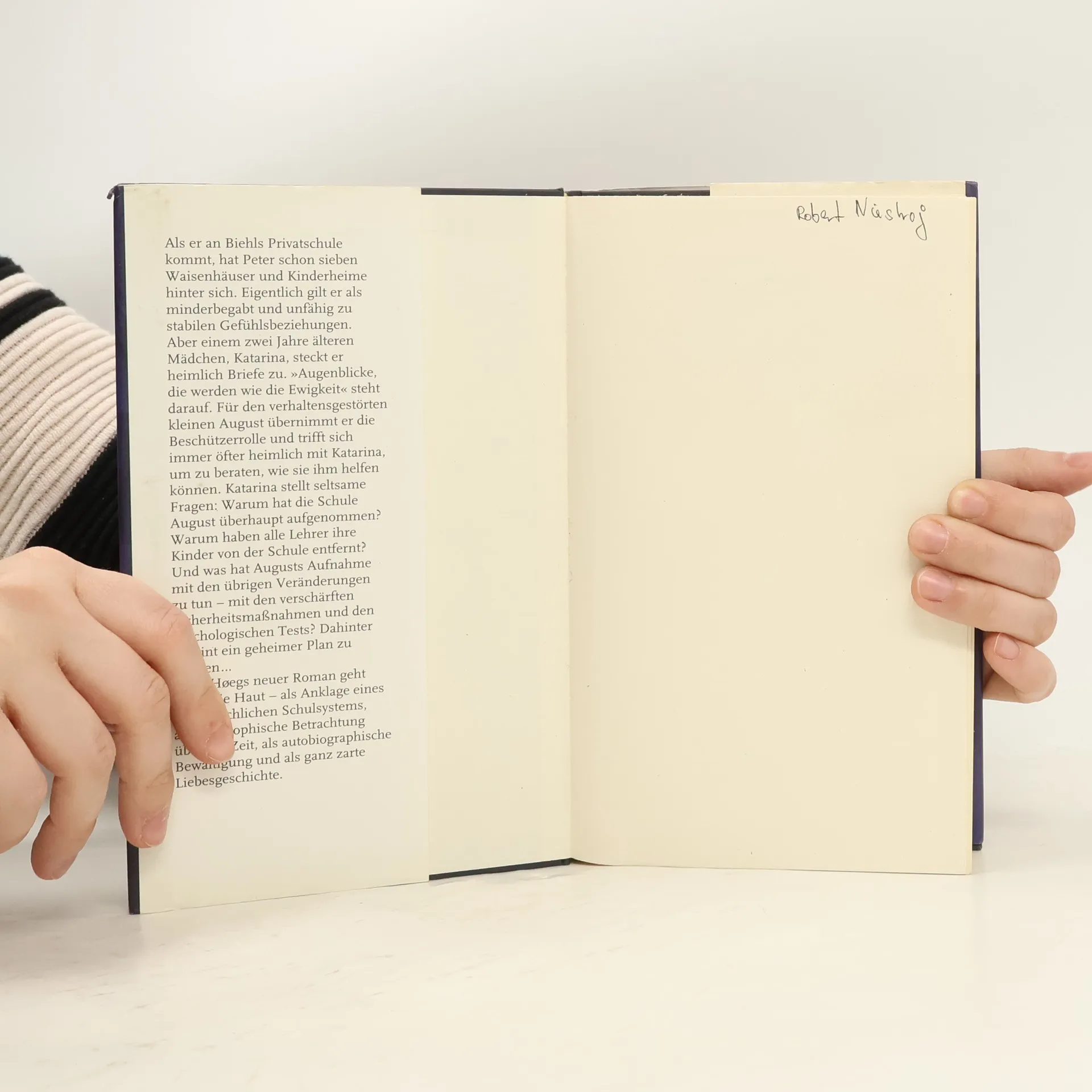 Als er an Biehls Privatschule kommt, hat Peter schon sieben Waisenhäuser und Kinderheime hinter sich. Immer öfter trifft er sich nun heimlich mit Katarina, um zu beraten: Warum haben alle Lehrer ihre Kinder von der Schule genommen ? Und was hat es mit den verschärften Sicherheitsmaßnahmen auf sich? Peter Hoegs Roman geht unter die Haut - als Anklage eines unmenschlichen Schulsystems, als philosophische Betrachtung über die Zeit, als autobiographische Bewältigung und als ganz zarte Liebesgeschichte.