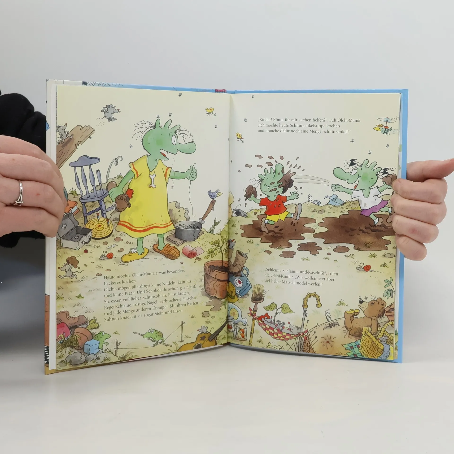 Die Olchis sind da! Das erste Bilderbuch aus Schmuddelfing Die Olchis sind grün, haben Hörner statt Ohren, wohnen auf einem Müllberg - und alle Kinder lieben sie! Wenn die Olchis mal nicht den ganzen Tag rummuffeln, gibt es viel zu tun. Die Olchi-Oma muss zum Beispiel dringend mal wieder die Höhle dreckig machen. Die Olchi-Kinder haben keine Zeit und Lust ihr zu helfen. Sie nehmen lieber ein Müllbad, springen über Schlammpfützen oder fliegen mit dem Drachen Feuerstuhl ein bisschen herum. Und als sie fertig mit Spielen sind, da ist es zum Helfen zu spät! Lust zum Singen haben die Olchis aber immer, und wenn dann das Olchi-Lied über die Müllkippe schallt, ist es so richtig schaurig schön... Lustiges, freches Bilderbuch-Abenteuer für Kinder ab 4 Jahren. Der perfekte Einstieg in die große, bunte Olchi-Welt mit Erstlesebüchern, Kinderbücher, Spielen, uvm. Mit Text und Noten vom Olchi-Lied.