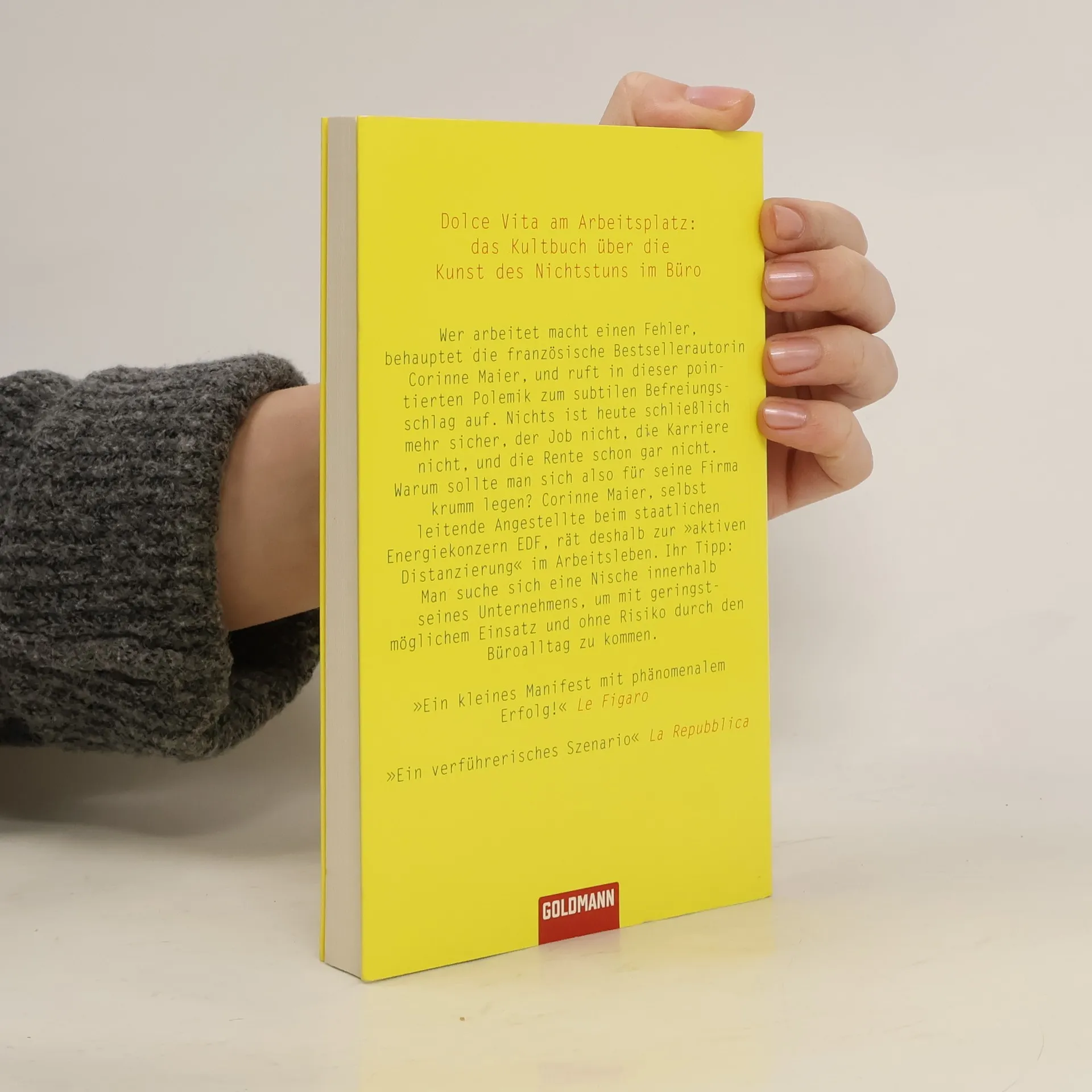 Dolce Vita am Arbeitsplatz: das Kultbuch über die Kunst des Nichtstuns im Büro. Wer arbeitet, macht einen Fehler, behauptet die französische Bestsellerautorin Corinne Maier, die mit ihrem Buch „Bonjour paresse“ die Grande Nation in Aufruhr versetzte. Nichts ist heute mehr sicher und selbstverständlich, der Job nicht, die Karriere nicht, und die Rente schon gar nicht. Warum sollte man sich also für seine Firma krumm legen? Corinne Maier, selbst leitende Angestellte beim staatlichen Energiekonzern EDF (Electricité de France), rät in ihrer pointierten Polemik deshalb zur „aktiven Distanzierung“ im Arbeitsleben. Innerhalb seines Unternehmens suche man sich möglichst eine Nische, um mit geringstmöglichem Einsatz und ohne Risiko durch den Büroalltag zu kommen. Laut Umfrage haben sich bereits 17 Prozent der Franzosen diesem subversiven Aufruf zu Individualismus und Ineffizienz angeschlossen. „Corinne Maier macht sich lustig und weiß es besser, ihr Ton verrät Humor und Kampfeslust.“ Le Figaro „Arbeiter aller Länder vereinigt euch und hört auf zu arbeiten. Unter dem schönen Titel “Bonjour paresse„ stellt Maier die Arbeitsmoral der Angestellten in Frage.“ International Herald Tribune „Corinne Maier hat offenbar einen Nerv getroffen mit diesem Vademecum für alle, die sich bei der Arbeit auf das Nötigste beschränken wollen.“ Corriere della Sera