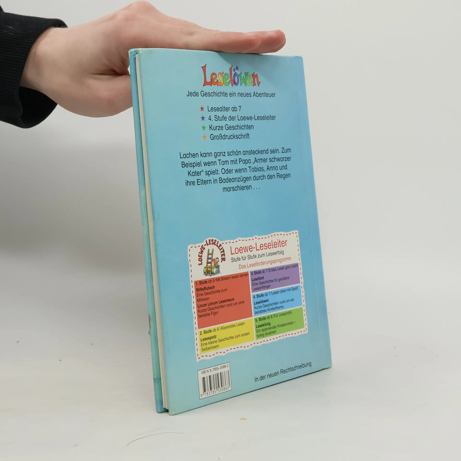 Lesealter ab 8 4. Stufe der Loewe-Leseleiter Kurze Geschichten Großdruckschrift Lachen kann ganz schön ansteckend sein. Zum Beispiel wenn Tom mit Papa „Armer schwarzer Kater“ spielt. Oder wenn Tobias, Anna und ihre Eltern in Badeanzügen durch den Regen marschieren.