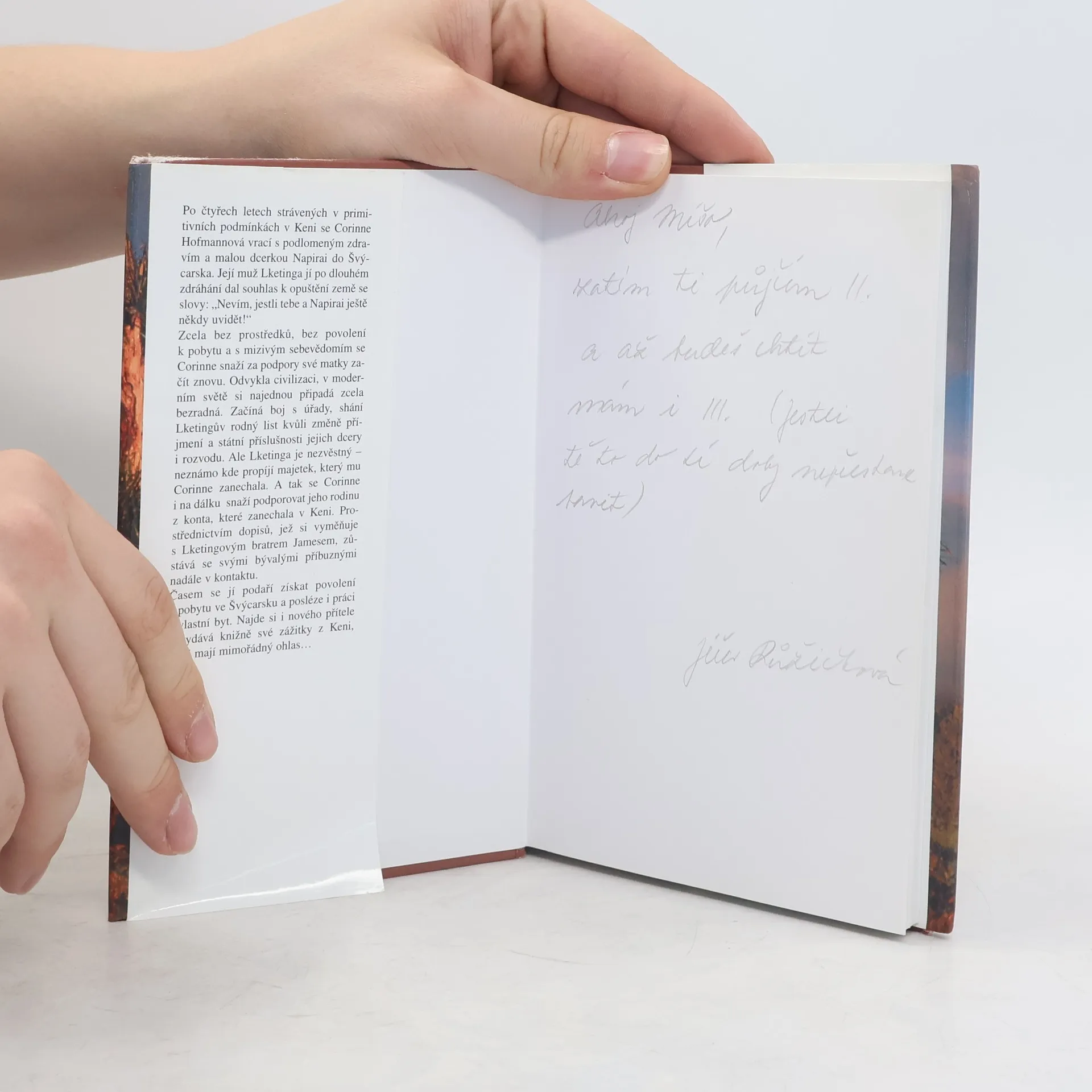 Po čtyřech letech strávených v primitivních podmínkách v Keni se Corinne Hofmannová vrací s podlomeným zdravím a malou dcerkou Napirai do Švýcarska. Její muž Lketinga jí po dlouhém zdráhání podepsal povolení k opuštění země se slovy: "Nevím, jestli tebe a Napirai ještě někdy uvidět!" Zcela bez prostředků, bez povolení k pobytu a s mizivým sebevědomím se Corinne snaží za podpory své matky začít znovu. Odvykla civilizaci, v moderním světě si najednou připadá zcela bezradná. Začíná boj s úřady, shánění Lketingova rodného listu, kvůli změně příjmení a státní příslušnosti jejich dcery i rozvodu. Ale Lketinga je nezvěstný - neznámo kde propíjí majetek, který mu Corinne zanechala. A tak se Corinne i na dálku navíc snaží podporovat jeho rodinu z konta, které zanechala v Keni. Prostřednictvím dopisů, které si vyměňuje s Lketingovým bratrem Jamesem, zůstává se svými bývalými příbuznými i nadále v kontaktu. Časem se jí podaří získat povolení k pobytu a posléze i práci a vlastní byt. Najde si i nového přítele a vydává knižně své zážitky z Keni, které mají mimořádný ohlas...