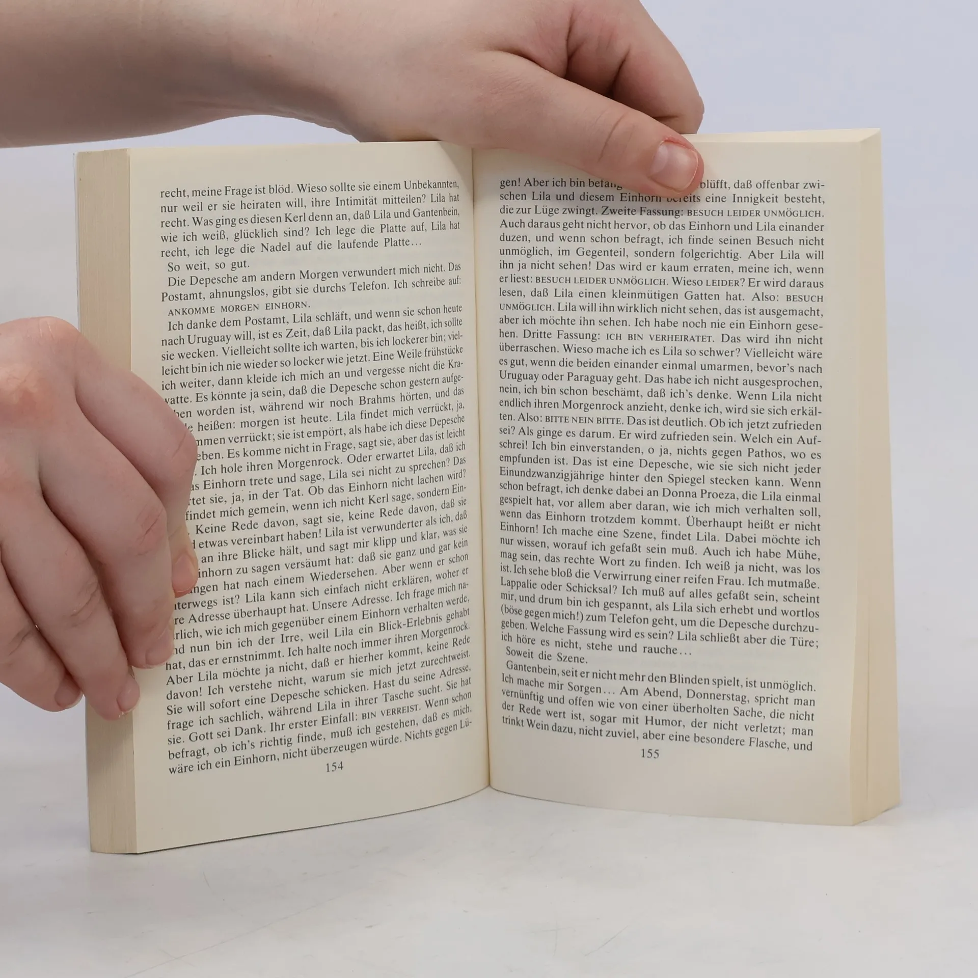 Der Erzähler erfindet (»Ich stelle mir vor:«) mögliche Lebensgeschichten dreier Personen: Da ist Gantenbein, der einen Blinden spielt, um so genauer seine Umwelt beobachten zu können. Oder da ist Enderlin, der immer »ein fremder Herr« bleibt. Auch Svoboda muß die Erfahrung machen, daß Liebe und Ehe endlich sind. Übrig im Spiel der erdichteten Rollen bleibt: Gantenbein.