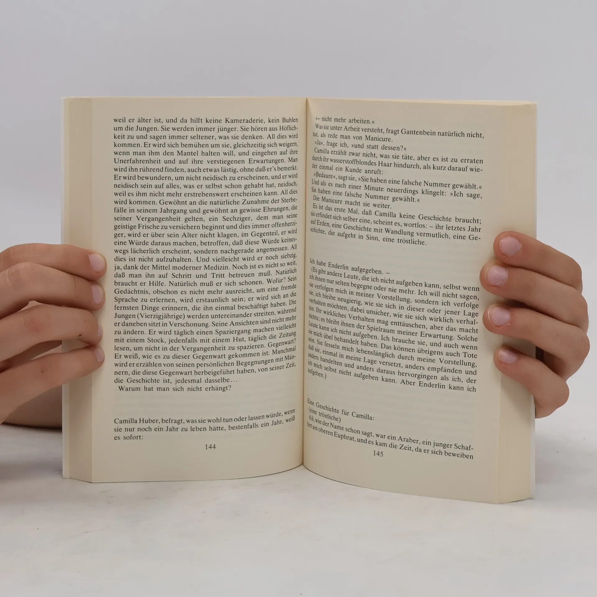 Der Erzähler erfindet (»Ich stelle mir vor:«) mögliche Lebensgeschichten dreier Personen: Da ist Gantenbein, der einen Blinden spielt, um so genauer seine Umwelt beobachten zu können. Oder da ist Enderlin, der immer »ein fremder Herr« bleibt. Auch Svoboda muß die Erfahrung machen, daß Liebe und Ehe endlich sind. Übrig im Spiel der erdichteten Rollen bleibt: Gantenbein.