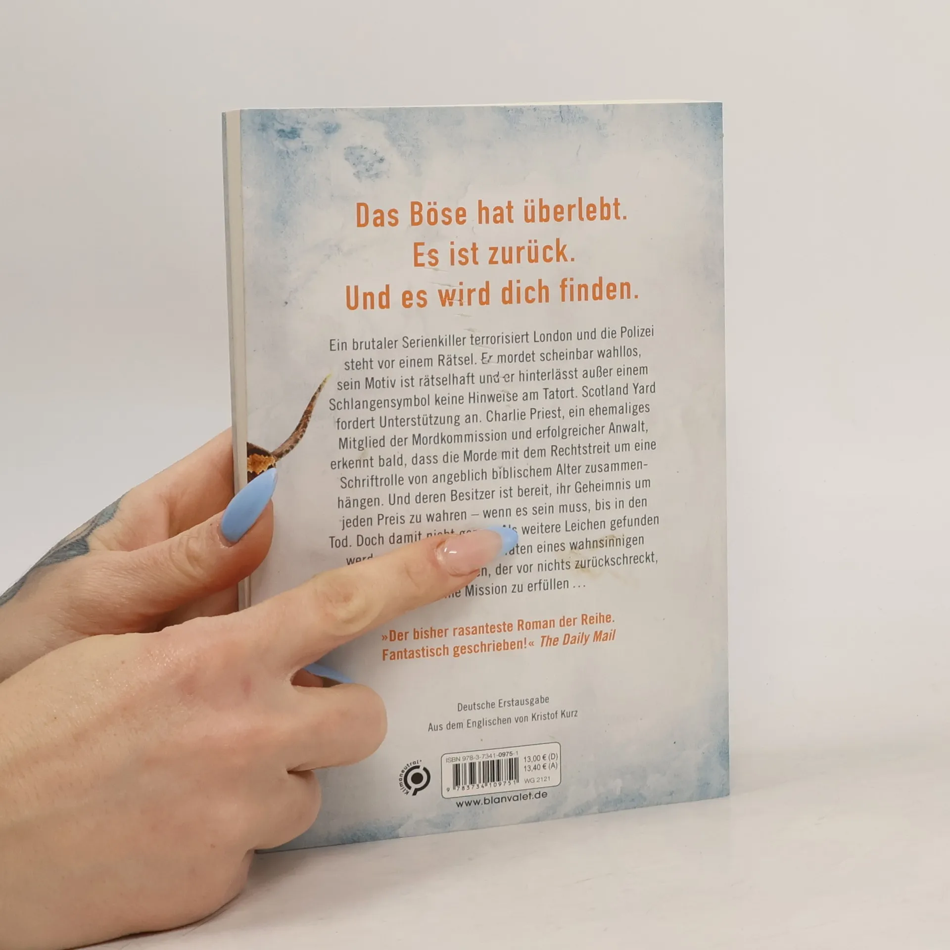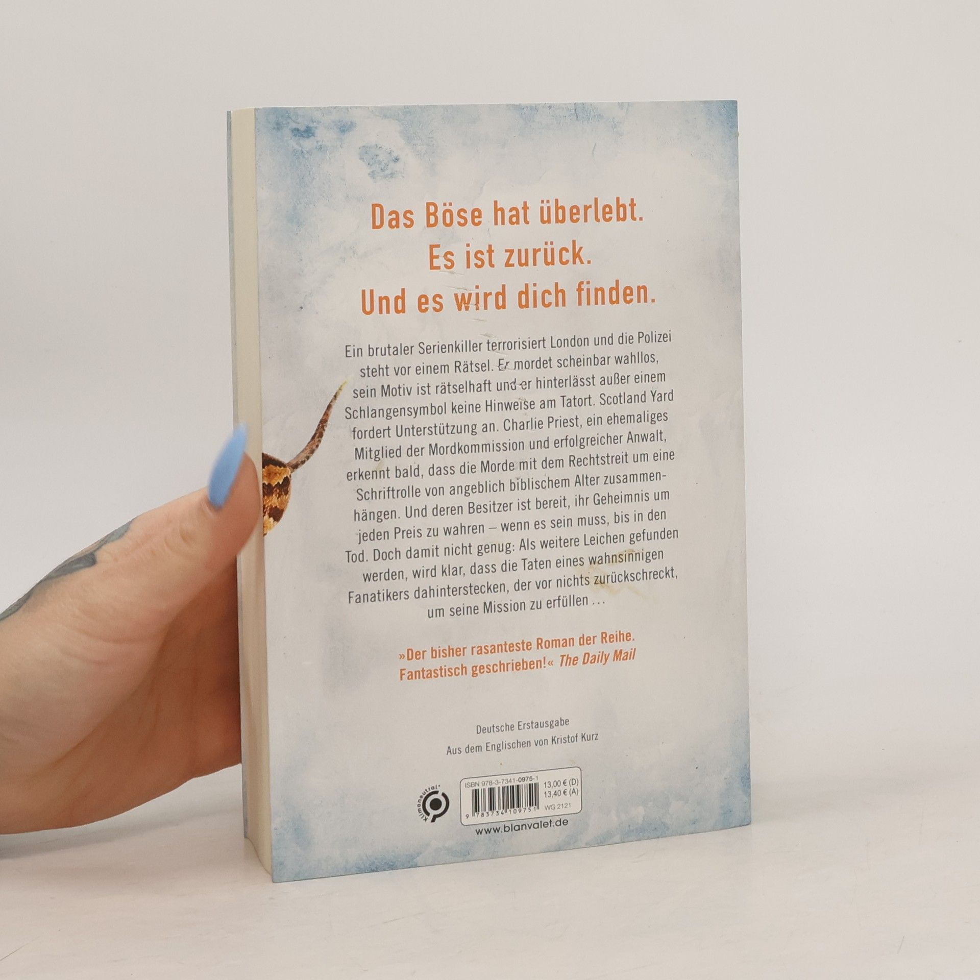 Das Böse hat überlebt. Es ist zurück. Und es wird dich finden. Ein brutaler Serienkiller terrorisiert London und die Polizei steht vor einem Rätsel. Er mordet scheinbar wahllos, sein Motiv ist rätselhaft und er hinterlässt außer einem Schlangensymbol keine Hinweise am Tatort. Scotland Yard fordert Unterstützung an. Charlie Priest, ein ehemaliges Mitglied der Mordkommission und erfolgreicher Anwalt, erkennt bald, dass die Morde mit dem Rechtstreit um eine Schriftrolle von angeblich biblischem Alter zusammenhängen. Und deren Besitzer ist bereit, ihr Geheimnis um jeden Preis zu wahren – wenn es sein muss, bis in den Tod. Doch damit nicht genug: Als weitere Leichen gefunden werden, wird klar, dass die Taten eines wahnsinnigen Fanatikers dahinterstecken, der vor nichts zurückschreckt, um seine Mission zu erfüllen ... Die unabhängig voneinander lesbaren Thriller um Ermittler Charlie Priest bei Blanvalet: 1. The Mayfly. Die Chemie des Bösen 2. Die Puppe. Vertraue nicht dem Bösen 3. Die Schlange. Das Böse hat überlebt