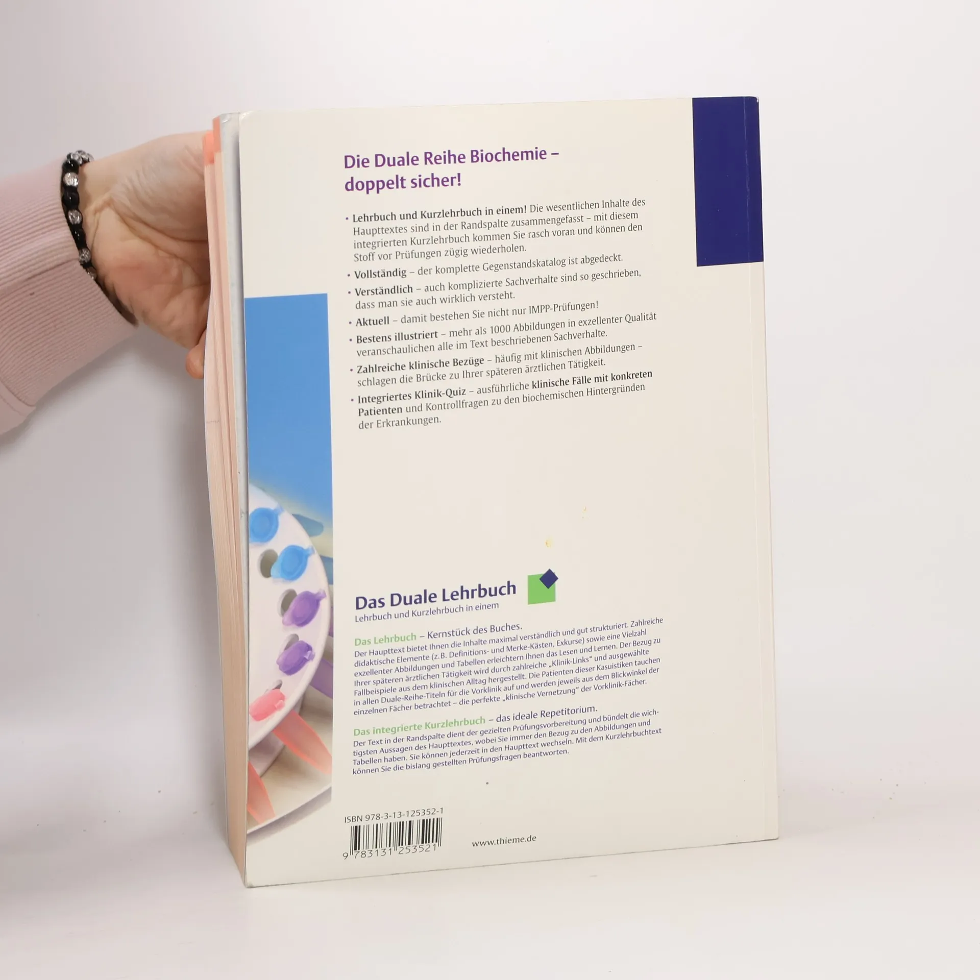 Die Duale Reihe Biochemie - doppelt sicher! Lehrbuch und Kurzlehrbuch in einem! Die wesentlichen Inhalte des Haupttextes sind in der Randspalte zusammengefasst - mit diesem integrierten Kurzlehrbuch kommen Sie rasch voran und können den Stoff vor Prüfungen zügig wiederholen. Vollständig - der komplette Gegenstandskatalog ist abgedeckt.