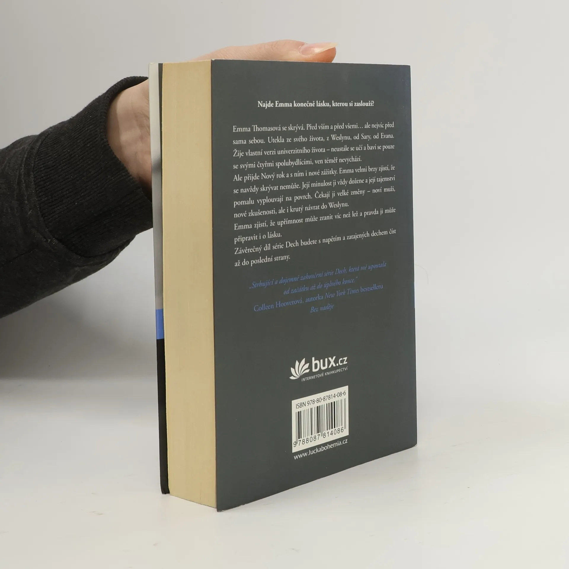Emma Thomasová se skrývá. Před vším a před všemi… ale nejvíc před sama sebou. Utekla ze svého života, z Weslynu, od Sary, od Evana. Žije vlastní verzi univerzitního života - neustále se učí a baví se pouze se svými čtyřmi spolubydlícími, ven téměř nevychází. Ale přijde Nový rok a s ním i nové zážitky. Emma velmi brzy zjistí, že se navždy skrývat nemůže. Její minulost ji vždy dožene a její tajemství pomalu vyplouvají na povrch. Čekají ji velké změny - noví muži, nové zkušenosti, ale i krutý návrat do Weslynu. Emma zjistí, že upřímnost může zranit víc než lež a pravda ji může připravit i o lásku. Závěrečný díl série Dech budete s napětím a zatajeným dechem číst až do poslední strany.