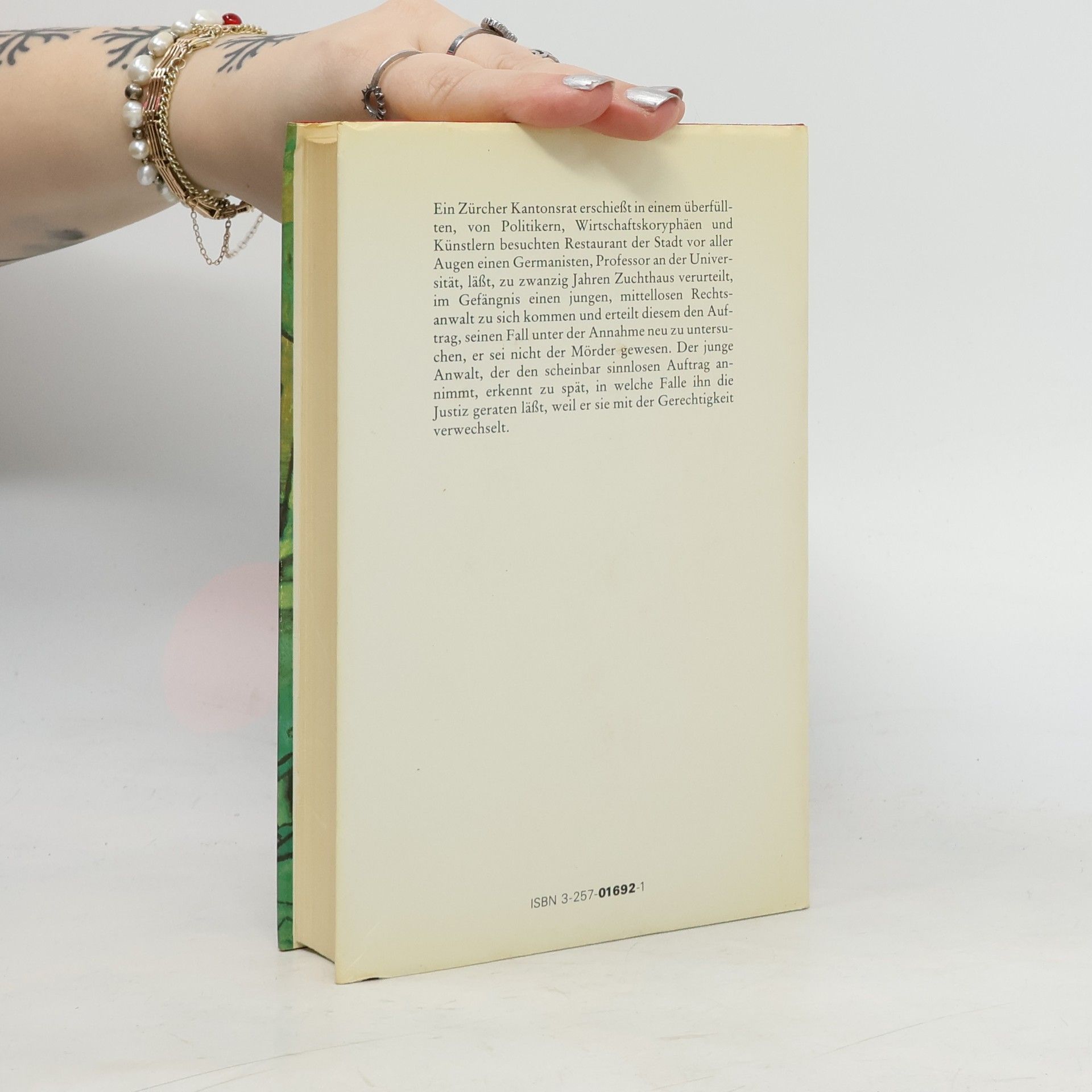Ein Zürcher Kantonsrat erschießt in einem überfüllten, von Politikern, Wirtschaftskoryphäen und Künstlern besuchten Restaurant der Stadt vor aller Augen einen Germanisten, Professor an der Universität, läßt, zu zwanzig Jahren Zuchthaus verurteilt, im Gefängnis einen jungen, mittellosen Rechtsanwalt zu sich kommen und erteilt diesem den Auftrag, seinen Fall unter der Annahme neu zu untersuchen, er sei nicht der Mörder gewesen. Der junge Anwalt, der den scheinbar sinnlosen Auftrag annimmt, erkennt zu spät, in welche Falle ihn die Justiz geraten läßt, weil er sie mit der Gerechtigkeit verwechselt.