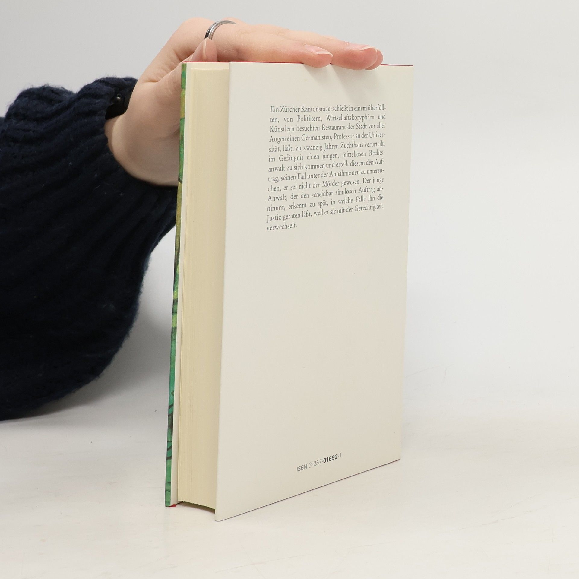 Ein Zürcher Kantonsrat erschießt in einem überfüllten, von Politikern, Wirtschaftskoryphäen und Künstlern besuchten Restaurant der Stadt vor aller Augen einen Germanisten, Professor an der Universität, läßt, zu zwanzig Jahren Zuchthaus verurteilt, im Gefängnis einen jungen, mittellosen Rechtsanwalt zu sich kommen und erteilt diesem den Auftrag, seinen Fall unter der Annahme neu zu untersuchen, er sei nicht der Mörder gewesen. Der junge Anwalt, der den scheinbar sinnlosen Auftrag annimmt, erkennt zu spät, in welche Falle ihn die Justiz geraten läßt, weil er sie mit der Gerechtigkeit verwechselt.