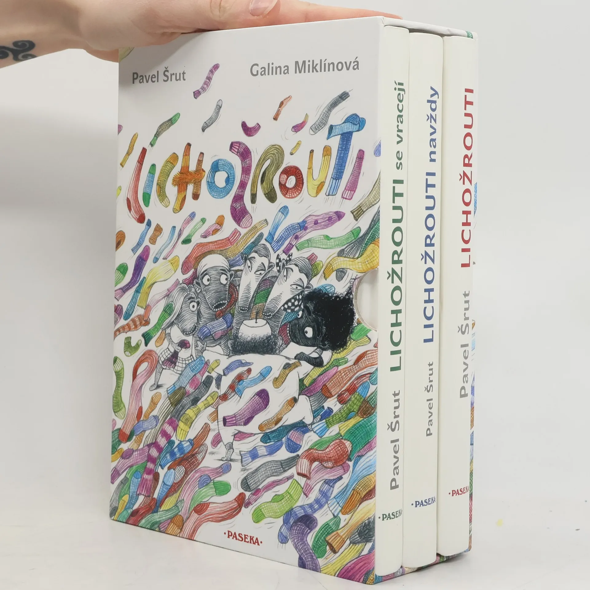 Základní literatura lichožroutologie je konečně dostupná v třídílném kompletu. Ačkoli nebyl ani po letech objev lichožroutů, kteří se s námi lidmi dělí o ponožky i obydlí, dosud doceněn akademiky, každé dítě ví, že jejich příběh je napínavé čtení a velká legrace. Všichni zúčastnění – lichožroutologové profesor René Kadeřábek a Jasmína Miklíková, Egon Vavřinec, lichožrouti Hihlík, Tulík, Kawa, Kudla Dederon, tvůrci lichožroutí ságy Pavel Šrut a Galina Miklínová a mnozí další aktéři – prohlašují, že příběh je pravdivý a jakákoli podobnost se skutečností není ani trochu náhodná. Komplet obsahuje tituly: Lichožrouti, Lichožrouti se vracejí, Lichožrouti navždy.