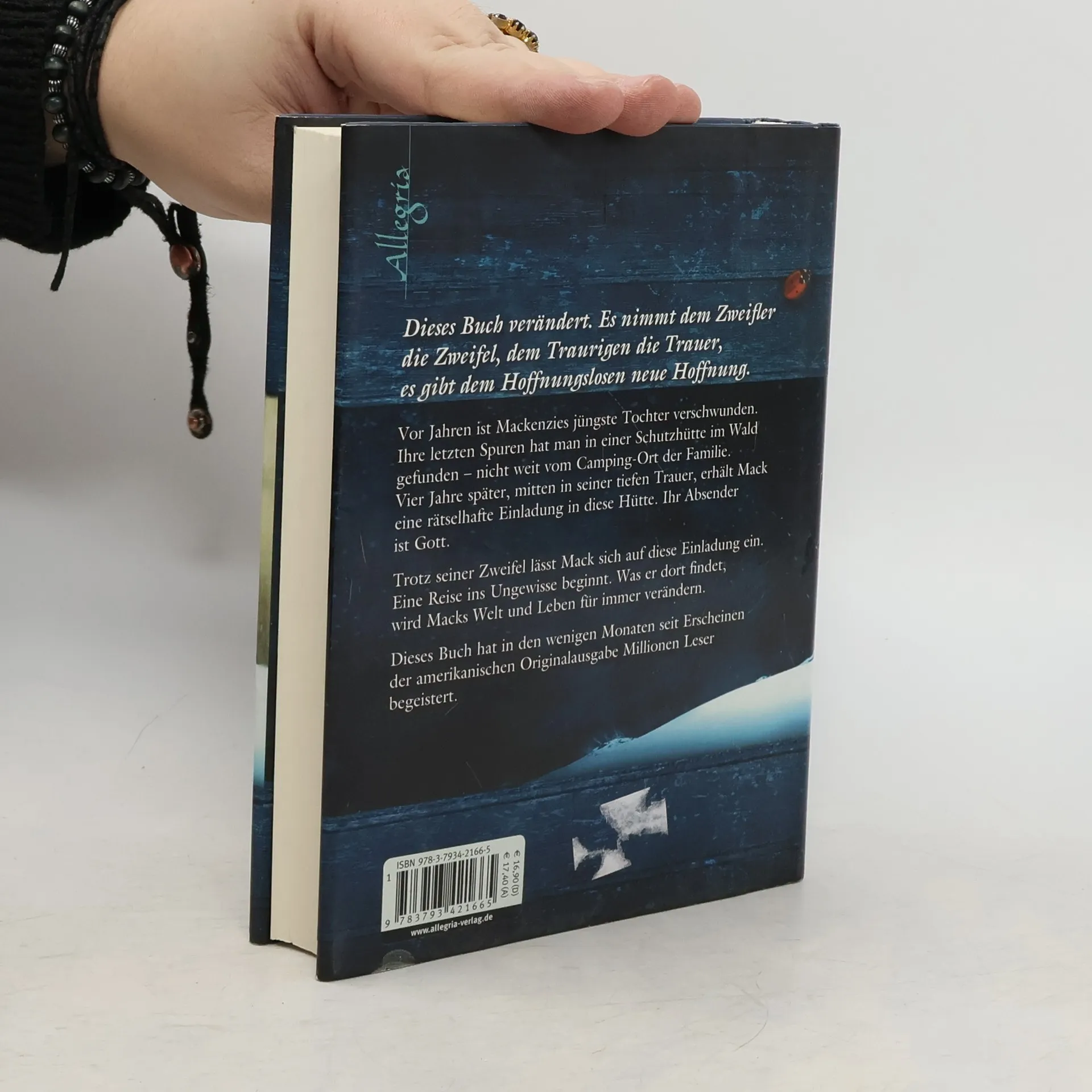Vor Jahren ist Mackenzies jüngste Tochter verschwunden. Ihre letzten Spuren hat man in einer Schutzhütte im Wald gefunden – nicht weit vom Camping-Ort der Familie. Vier Jahre später, mitten in seiner tiefen Trauer, erhält Mack eine rätselhafte Einladung in diese Hütte. Ihr Absender ist Gott. Trotz seiner Zweifel lässt Mack sich auf diese Einladung ein. Eine Reise ins Ungewisse beginnt. Was er dort findet, wird Macks Welt und Leben für immer verändern ... Dieses Buch hat in den wenigen Monaten seit Erscheinen der amerikanischen Originalausgabe Millionen Leser begeistert.