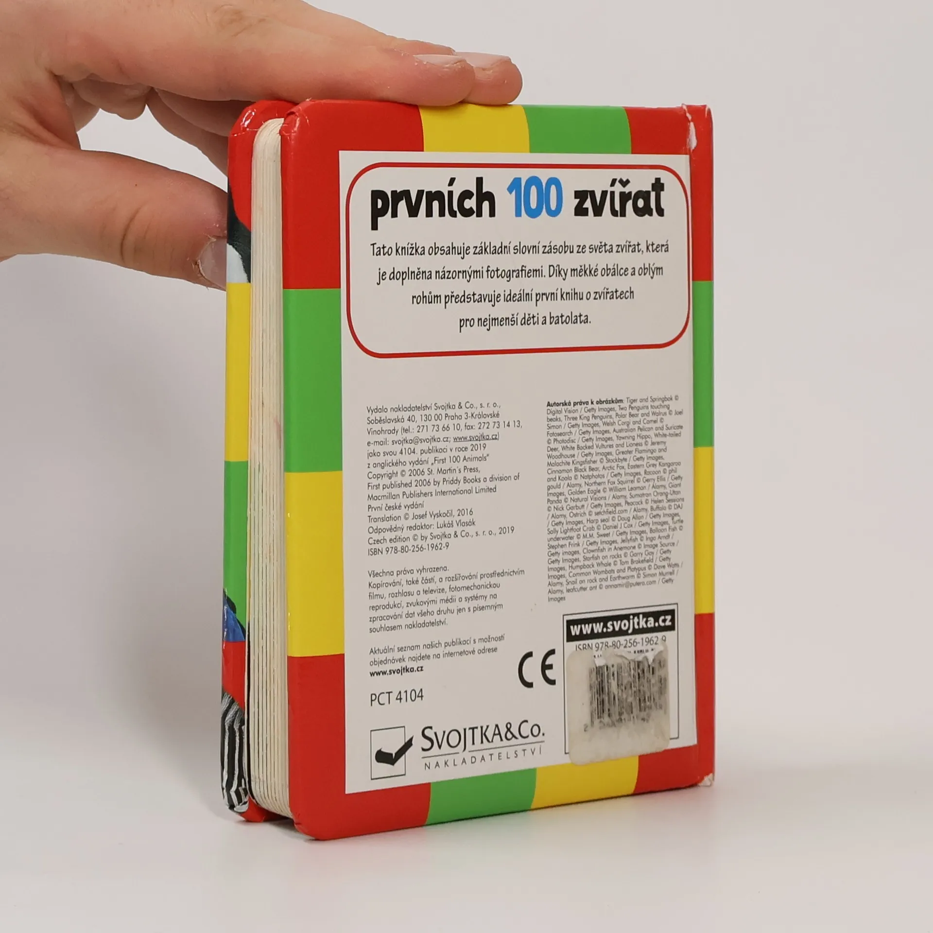 V této knížce určené těm nejmenším "čtenářům", ale především jejich rodičům, kteří mají zájem na rozvíjení slovní zásoby svých dětí, je představeno 100 zvířat na barevných fotografiích s popisky. Měkká obálka a zaoblené rohy umožňují vašim ratolestem pustit se náruživě do "čtení", aniž byste se museli obávat o bezpečnost dětí či stav knihy. Na stránkách najdete přehledně roztříděné názvy zvířat dle několika kategorií – domácí mazlíčci, polární zvířata, zvířata žijící v džungli aj. Kdo to bučí a mečí na statku? Kdopak se to schovává v lese? Naučte dětmi rozpoznávat i zvířata ze vzdálenějších kontinentů – Afriky a Austrálie. V knížce najdete zvířata velká (slon, medvěd, žirafa), ale i ta nejmenší – brouky a hmyz.