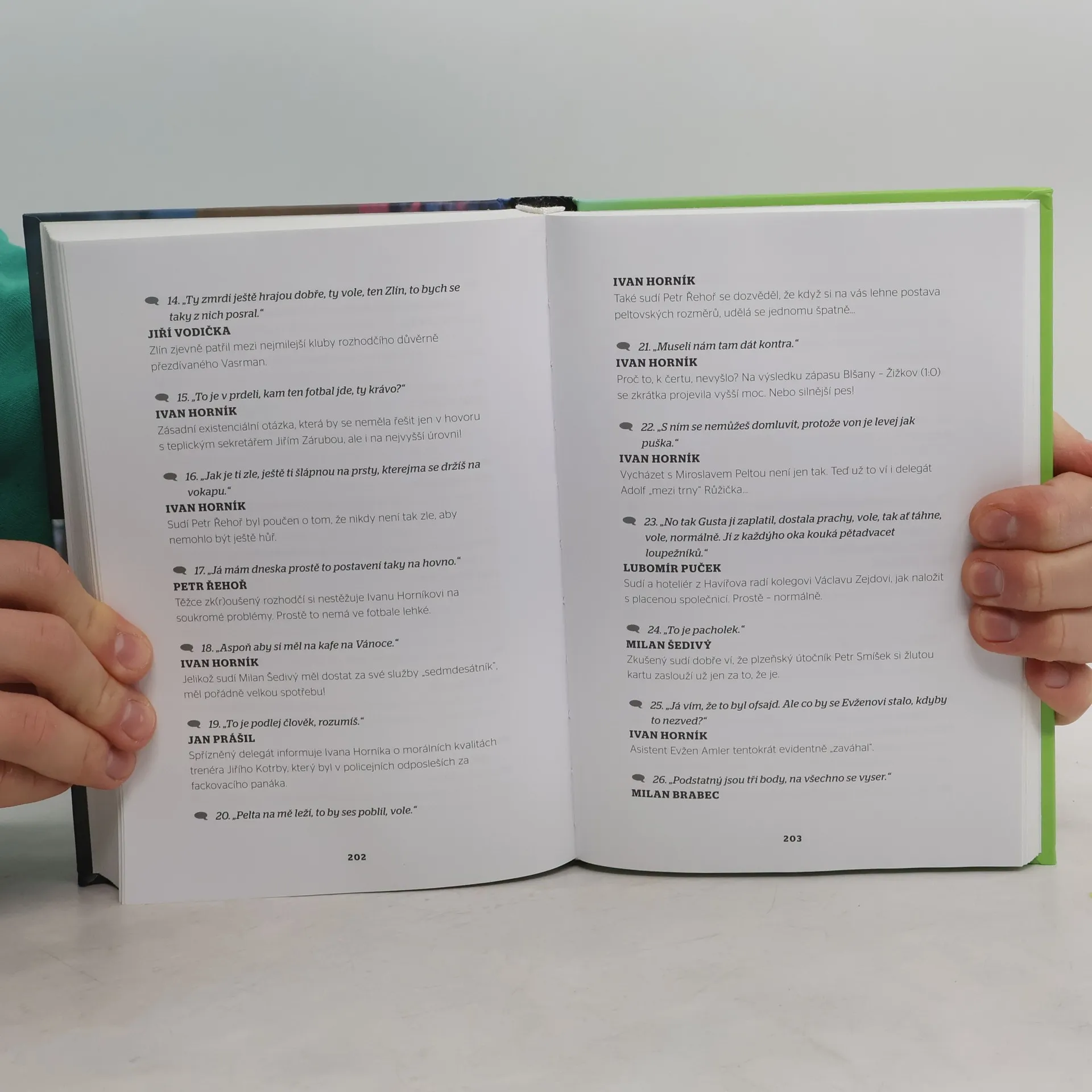 Kdo má rád fotbal, ten se s touto knížkou pobaví, protože hlášky ze světa kopané jsou veselé a občas mile vulgární. Někdy však mrazí, jelikož se ve fotbale točí velké peníze, s nimiž přichází švindl a úplatky. Spisovatel a novinář Štěpán Filípek dlouhodobě sbírá výstižné výroky hráčů, trenérů a klubových bossů, a nyní nabízí tisíc takových hlášek jako zábavnou kroniku posledních patnácti let našeho fotbalu. Z množství proslulých i méně známých postav se vynikají fotbaloví baviči Horváth a Švancara, komentátor Bosák, mediální rozumbrada Luhový a bohém Vízek. Nechybí ani čachrář Horník, známý jako „Ivánek, kamarád.“ Každý výrok je doplněn autorovou glosou, která rozvádí vtip nebo poskytuje kontext, a každou ze šestnácti kapitol otevírá zasvěcený úvod. Fotbal jako velký sport prostupuje celou společností, přináší radost i zklamání a zrcadlí její realitu. Například slova svazového místopředsedy Jaroslava Vacka, který se o peníze ve fotbale staral s takovou urputností, že mu začali říkat Jarda Miliarda: „Hráči vás zbožňují, dokud jim dáváte prachy. Až jim dáte poslední korunu, překročí vaši mrtvolu a odcházejí do dáli.“