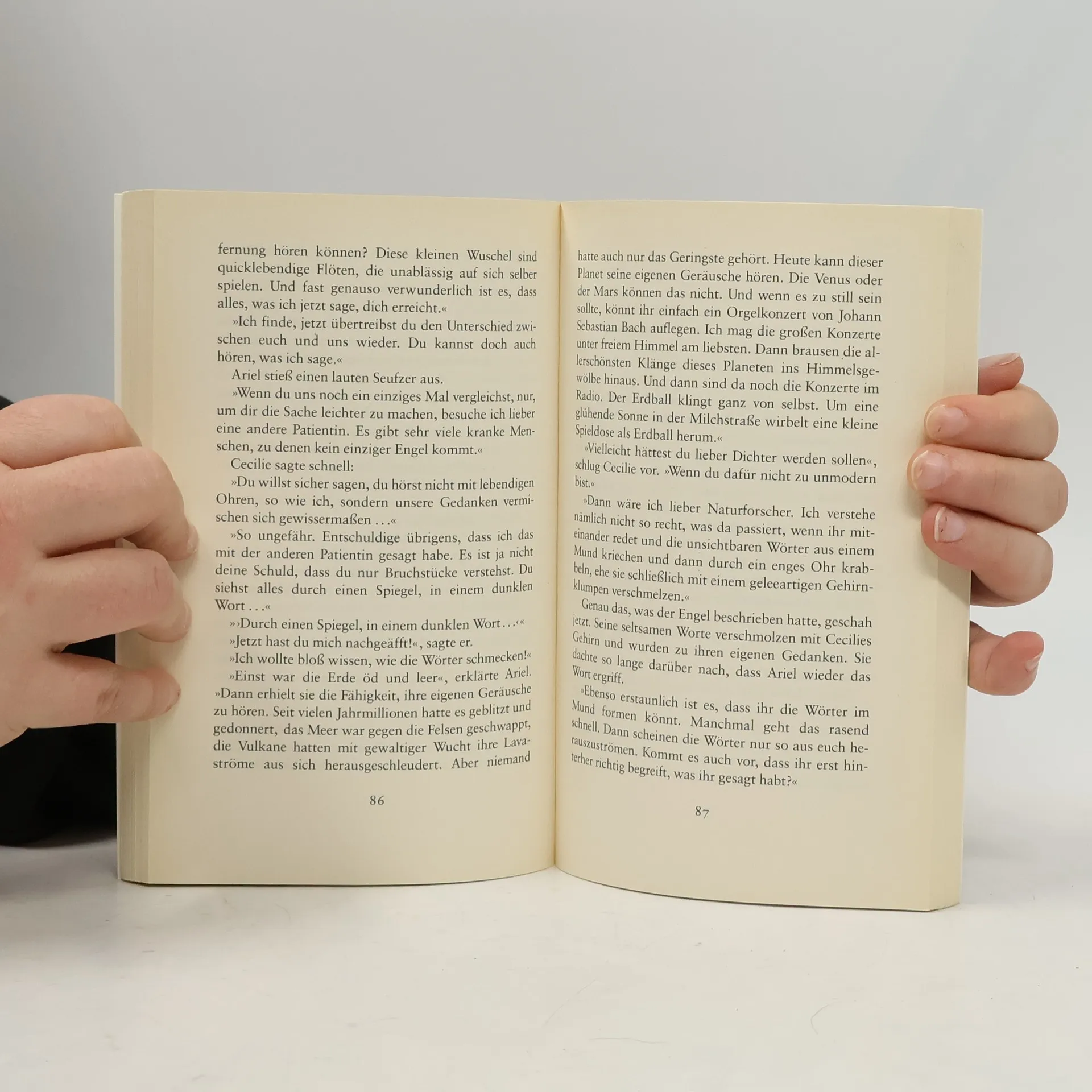 Jostein Gaarder greift in einer leicht verständlichen Sprache ein Tabuthema auf: Das Sterben eines krebskranken Kindes. Weihnachtsabend - Cecile liegt krank im Bett, dabei würde sie viel lieber mit ihrer Familie unten im Wohnzimmer feiern. Ihr einziger Trost: ihr redseliger kleiner Bruder Lasse, der sie über sämtliche Weihnachtsvorbereitungen informiert. Cecile ist nicht nur ein bisschen krank, sie hat nicht mal mehr die Kraft, in ihr kleines chinesisches Tagebuch zu schreiben. Trotz ihrer Krankheit wünscht sie sich von ihren Eltern zu Weihnachten Skier. Die alten sind viel zu kurz. Nach der Bescherung, zu der ihr Vater sie heruntergetragen hat, sinkt sie erschöpft ins Bett zurück, als sie plötzlich eine Stimme hört: Ariel heißt er und behauptet ein Engel zu sein. Mit ihm gemeinsam beginnt Cecile über Dinge nachzudenken. Cecile erklärt Ariel, wie eine Marzipanerdbeere schmeckt und Ariel berichtet, dass Engel schon immer dagewesen sind. So sieht sich Cecile zum ersten Mal in ihrem Leben herausgefordert, ihre Existenz in der Welt zu durchdenken. Und als sie mit ihm eines Tages auf ihrer Fensterbank sitzt, findet sie es seltsam, sich selbst auf dem Bett liegen zu sehen. Und doch findet sie sich auch schön.