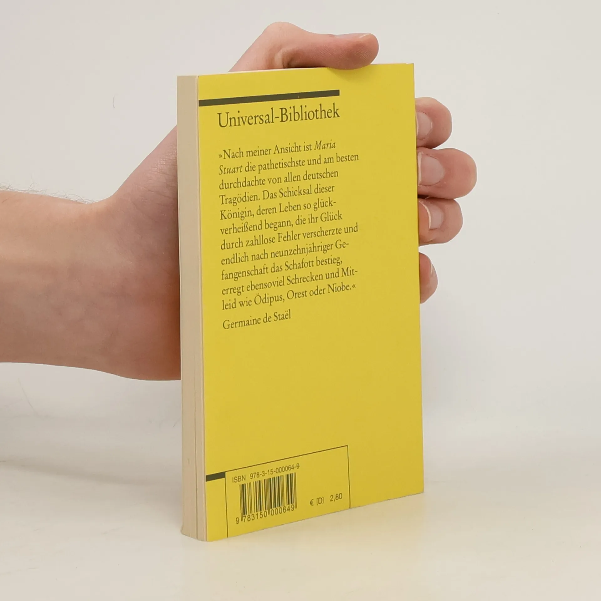 \"Nach meiner Ansicht ist Maria Stuart die pathetischste und am besten durchdachte von allen deutschen Tragödien. Das Schicksal dieser Königin, deren Leben so glückverheißend begann, die ihr Glück durch zahllose Fehler verscherzte und endlich nach neunzehnjähriger Gefangenschaft das Schafott bestieg, erregt ebensoviel Schrecken und Mitleid wie Ödipus, Orest oder Niobe.\" - Germaine de Stael