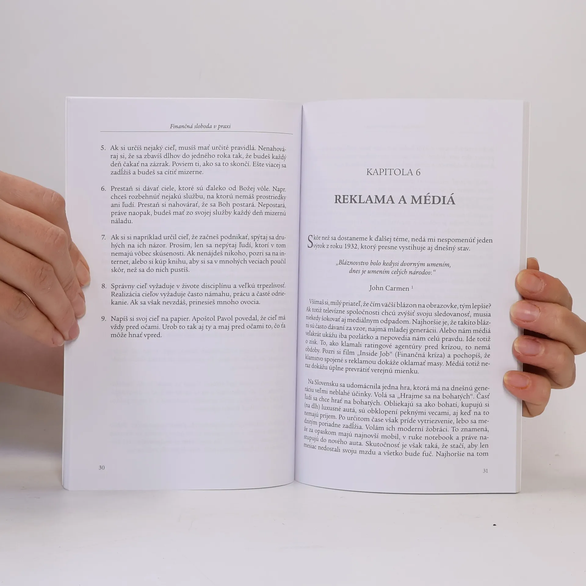 Obsah: Ako funguje dnešný svet, Disciplína, Zmena myslenia, Dobré dlhy-zlé dlhy, Jasný cieľ, Reklama a médiá, Desiatky a dary v praxi, Ešte o desiatkoch, Ako sa zbaviť dlhov, Trendy, Som vyhorený, Charakter 51 %, peniaze 49 %, Pravidlá, Vzdelanie, Podnikanie versus zamestnanie, Podnikanie online, Peniaze v manželstve, Muži nie sú ako ženy, Niekoľko múdrych rád na záver.