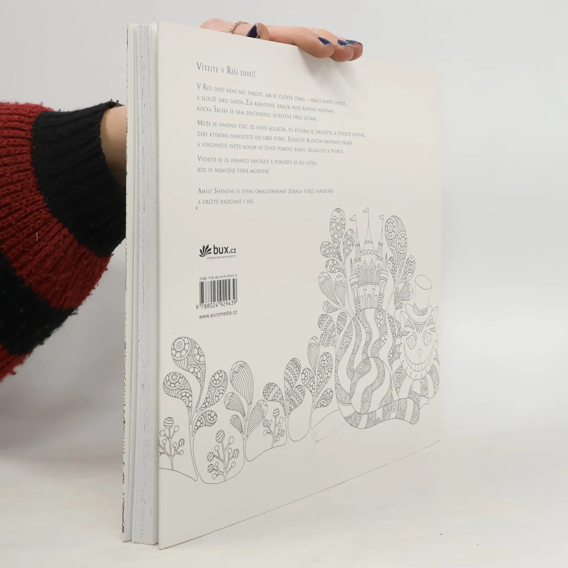 V Říši divů není nic takové, jak by člověk čekal – hrací karty slouží Zlé královně, králík nosí kapesní hodinky, kočka Šklíba se vám zničehonic rozplyne před očima. Může se stát, že sníte koláček, po kterém se zmenšíte a vypijete lektvar, díky kterému narostete do obří výšky. Vydejte se za hranice možného a vdechněte pomocí barev tomuto bláznivému světu originální podobu! Amily Shenová si svými omalovánkami získala tisíce fanoušků a určitě nadchne i vás.