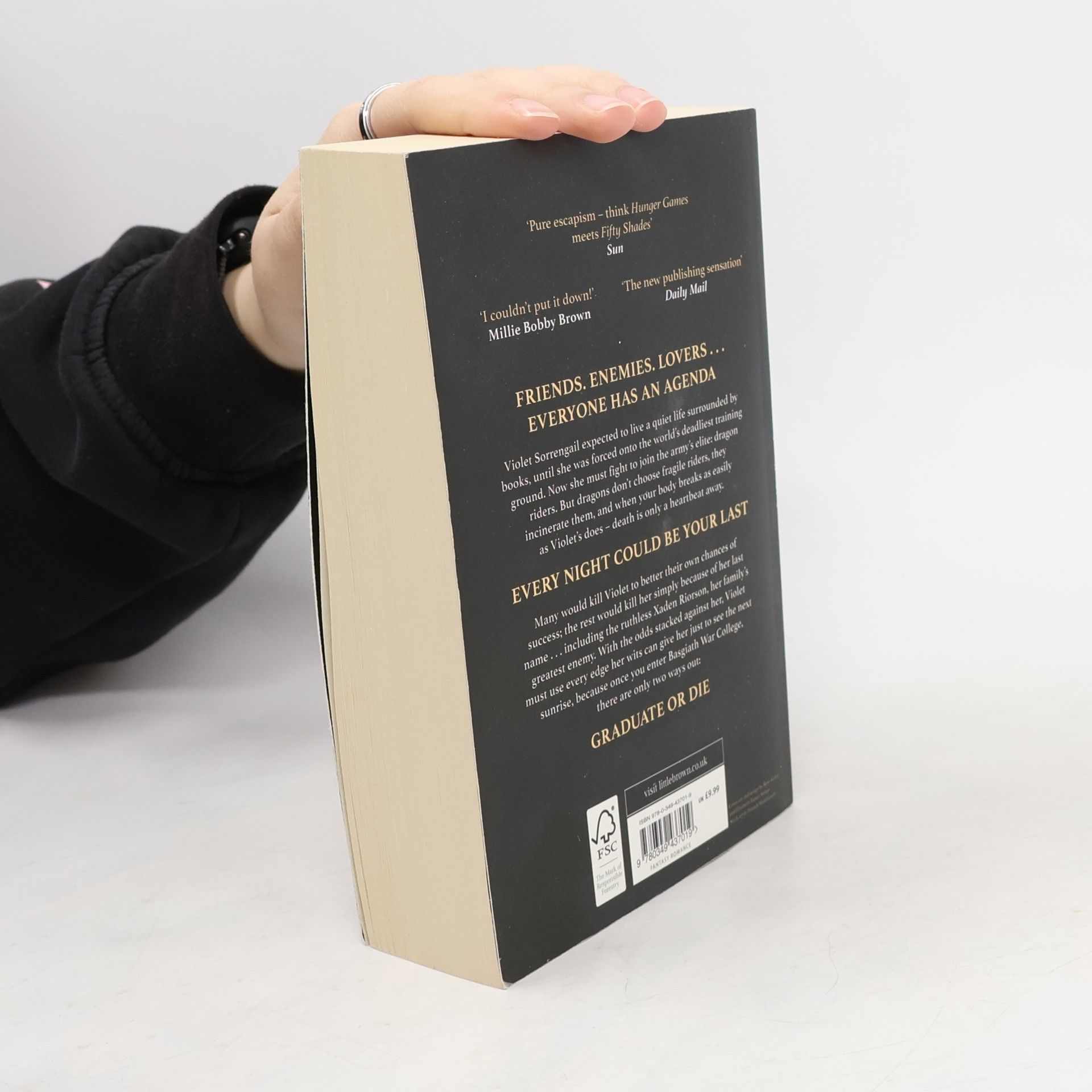 Twenty-year-old Violet Sorrengail was supposed to enter the Scribe Quadrant, living a quiet life among books and history. Now, the commanding general - also known as her tough-as-talons mother - has ordered Violet to join the hundreds of candidates striving to become the elite of Navarre: dragon riders. But when you're smaller than everyone else and your body is brittle, death is only a heartbeat away . . . because dragons don't bond to 'fragile' humans. They incinerate them. With fewer dragons willing to bond than cadets, most would kill Violet to better their own chances of success. The rest would kill her just for being her mother's daughter - like Xaden Riorson, the most powerful and ruthless wingleader in the Riders Quadrant. She'll need every edge her wits can give her just to see the next sunrise. Yet, with every day that passes, the war outside grows more deadly, the kingdom's protective wards are failing, and the death toll continues to rise. Even worse, Violet begins to suspect leadership is hiding a terrible secret. Everyone at Basgiath has an agenda, and every night could be your last. So, sleep with one eye open because once you enter, there are only two ways out: graduate or die .
