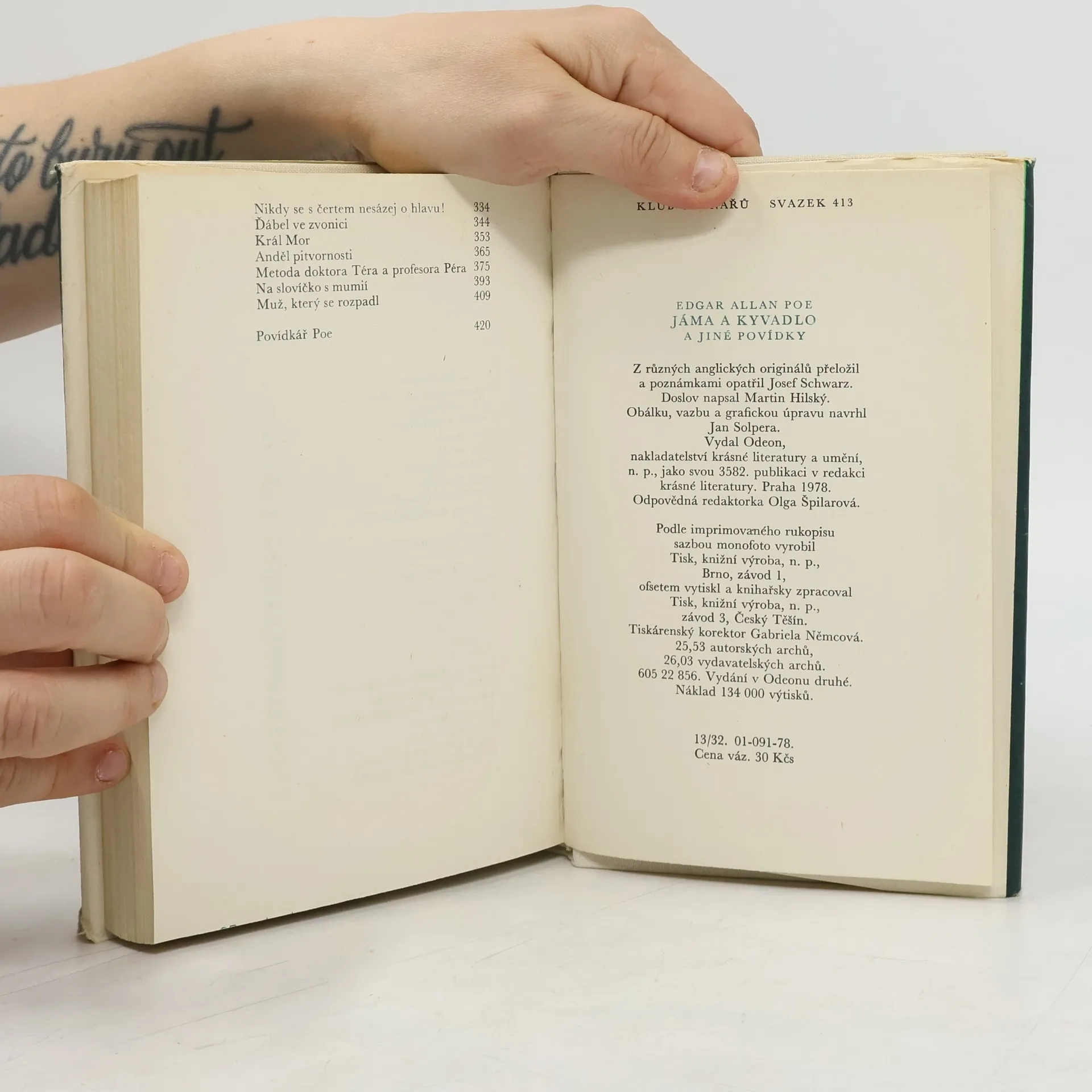 Čtyřiatřicet povídek známého spisovatele se snaží ukázat mnohotvárnost a všestrannost jeho talentu. Jde o příběhy, v nichž se jeví jako předchůdce povídky kriminální a detektivní, vědeckofantastické a jako žánru označovaného jménem horror. Autor v nich rozehrává svou jedinečnou fantazii a uplatňuje smysl pro logickou a rozumovou konstrukci. Povídky: Pád do Maelstömu, Rukopis nalezený v láhvi, Podlouhlá bedna, Vraždy v ulici Morgue, Zlatý brouk, Vrah jsi ty !, Předčasný pohřeb, Jáma a kyvadlo, Zánik domu Usherů, Sud vína amontilladského Skokan, Maska Červené smrti, Muž davu, Démon zvrácenosti, Berenice, William Wilson, Černý kocour, Zrádné srdce, Eleonora, Medailón, Rozhovor Eirose s Charmionem, Příběh z Rozeklaných hor, Tisící druhý Šeherezádin příběh, Senzace s balónem, Tři neděle v týdnu, Von Kempelen a jeho objev, O šizení jakožto exaktní vědě, Nikdy se s čertem nesázej o hlavu !, Ďábel ve zvonici, Král Mor, Anděl pitvornosti, Metoda doktora Téra a profesora Péra, Na slovíčko s mumií, Muž, který se rozpadl. Povídkář Poe. Vydání v Odeonu druhé. Edice Klub čtenářů, svazek 413.