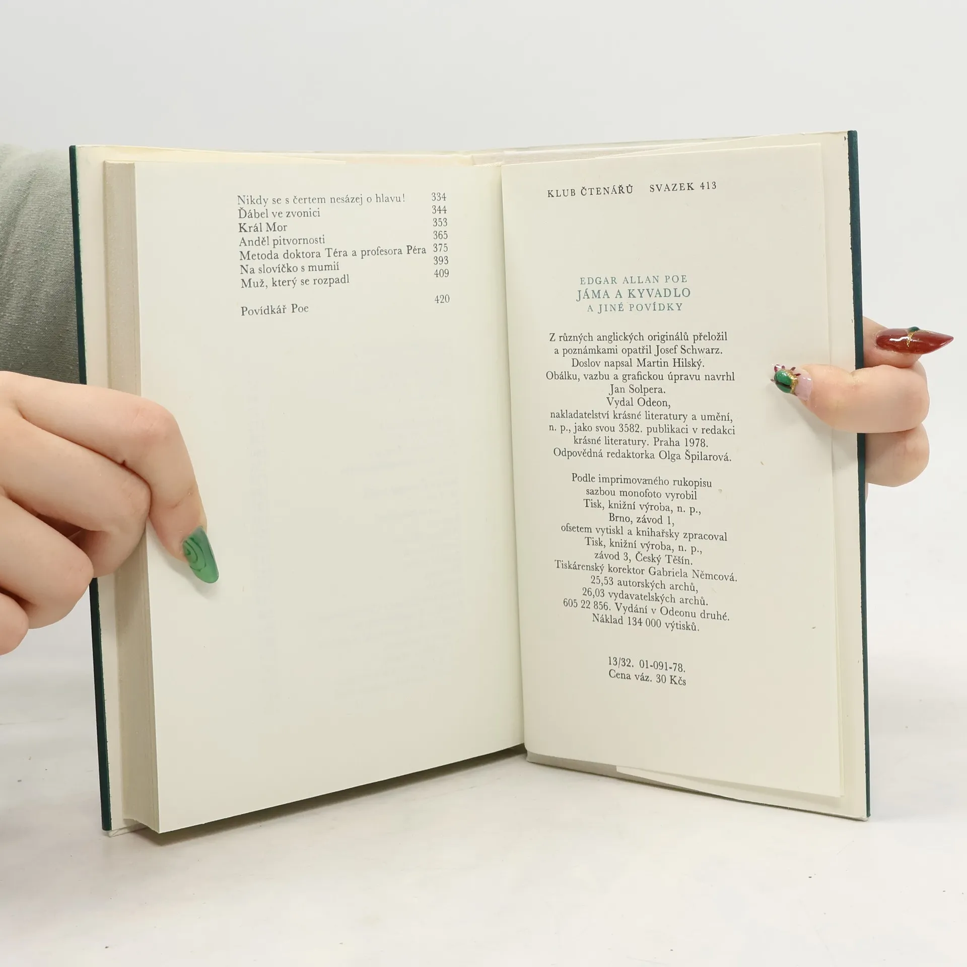 Čtyřiatřicet povídek známého spisovatele se snaží ukázat mnohotvárnost a všestrannost jeho talentu. Jde o příběhy, v nichž se jeví jako předchůdce povídky kriminální a detektivní, vědeckofantastické a jako žánru označovaného jménem horror. Autor v nich rozehrává svou jedinečnou fantazii a uplatňuje smysl pro logickou a rozumovou konstrukci. Povídky: Pád do Maelstömu, Rukopis nalezený v láhvi, Podlouhlá bedna, Vraždy v ulici Morgue, Zlatý brouk, Vrah jsi ty !, Předčasný pohřeb, Jáma a kyvadlo, Zánik domu Usherů, Sud vína amontilladského Skokan, Maska Červené smrti, Muž davu, Démon zvrácenosti, Berenice, William Wilson, Černý kocour, Zrádné srdce, Eleonora, Medailón, Rozhovor Eirose s Charmionem, Příběh z Rozeklaných hor, Tisící druhý Šeherezádin příběh, Senzace s balónem, Tři neděle v týdnu, Von Kempelen a jeho objev, O šizení jakožto exaktní vědě, Nikdy se s čertem nesázej o hlavu !, Ďábel ve zvonici, Král Mor, Anděl pitvornosti, Metoda doktora Téra a profesora Péra, Na slovíčko s mumií, Muž, který se rozpadl. Povídkář Poe. Vydání v Odeonu druhé. Edice Klub čtenářů, svazek 413.