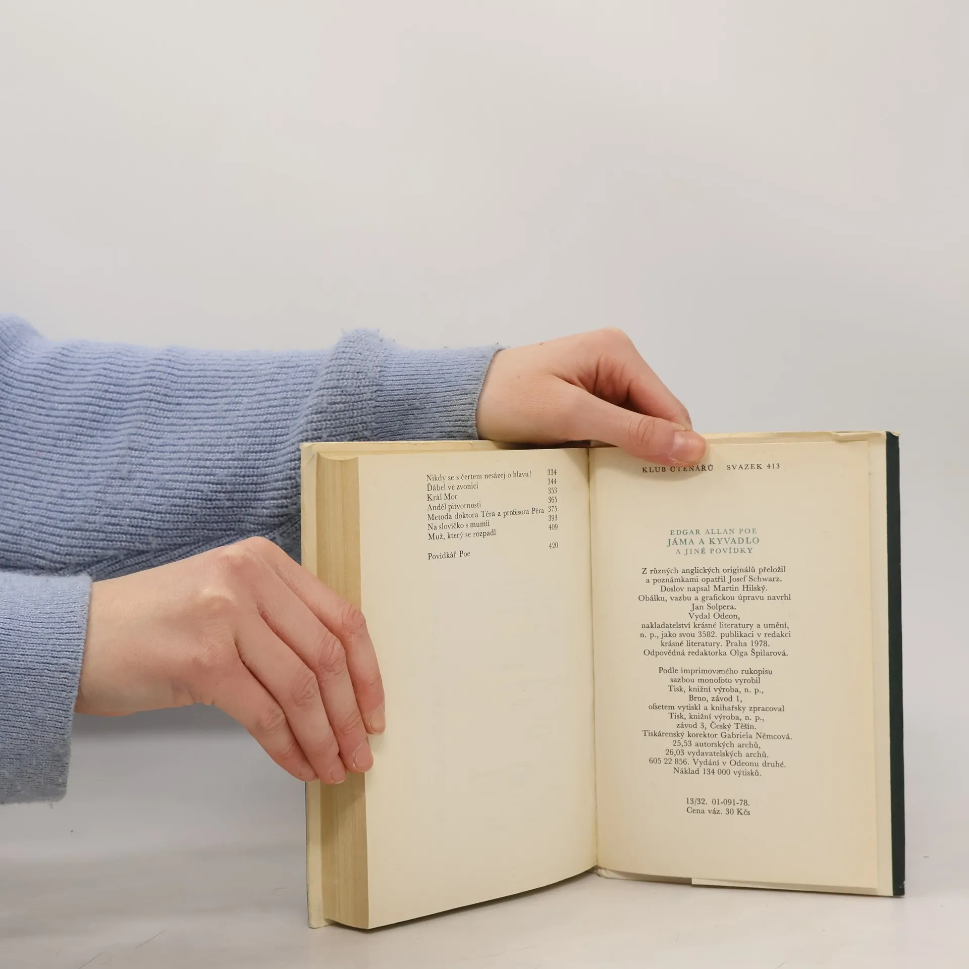 Čtyřiatřicet povídek známého spisovatele se snaží ukázat mnohotvárnost a všestrannost jeho talentu. Jde o příběhy, v nichž se jeví jako předchůdce povídky kriminální a detektivní, vědeckofantastické a jako žánru označovaného jménem horror. Autor v nich rozehrává svou jedinečnou fantazii a uplatňuje smysl pro logickou a rozumovou konstrukci. Povídky: Pád do Maelstömu, Rukopis nalezený v láhvi, Podlouhlá bedna, Vraždy v ulici Morgue, Zlatý brouk, Vrah jsi ty !, Předčasný pohřeb, Jáma a kyvadlo, Zánik domu Usherů, Sud vína amontilladského Skokan, Maska Červené smrti, Muž davu, Démon zvrácenosti, Berenice, William Wilson, Černý kocour, Zrádné srdce, Eleonora, Medailón, Rozhovor Eirose s Charmionem, Příběh z Rozeklaných hor, Tisící druhý Šeherezádin příběh, Senzace s balónem, Tři neděle v týdnu, Von Kempelen a jeho objev, O šizení jakožto exaktní vědě, Nikdy se s čertem nesázej o hlavu !, Ďábel ve zvonici, Král Mor, Anděl pitvornosti, Metoda doktora Téra a profesora Péra, Na slovíčko s mumií, Muž, který se rozpadl. Povídkář Poe. Vydání v Odeonu druhé. Edice Klub čtenářů, svazek 413.