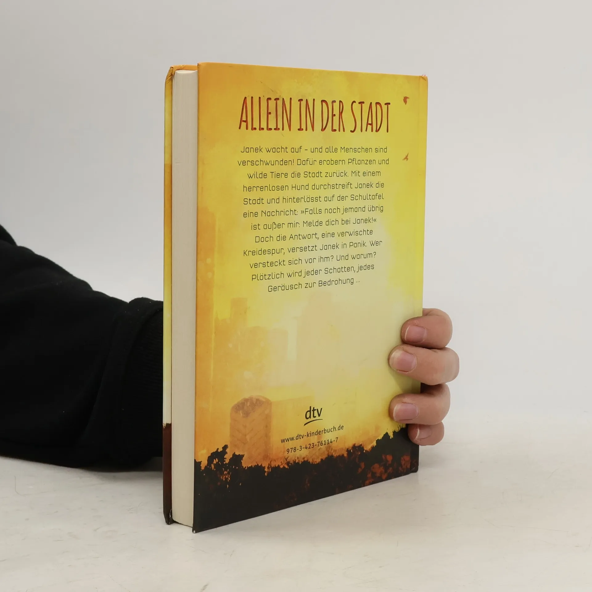 Was würdest du tun, wenn morgen alle weg wären? Janek wacht auf – und ist allein. Alle Menschen sind verschwunden! Dafür erobern Pflanzen und wilde Tiere die Stadt zurück. Verunsichert streift Janek mit einem herrenlosen Hund durch die überwucherten Straßen. Auf der Schultafel hinterlässt er eine Nachricht: »Falls noch jemand übrig ist außer mir: Melde dich bei Janek!« Die Antwort, eine verwischte Kreidespur, versetzt Janek in Panik. Wer versteckt sich vor ihm? Und warum? Plötzlich wird jeder Schatten, jedes Geräusch, jede Bewegung da draußen zur Bedrohung.