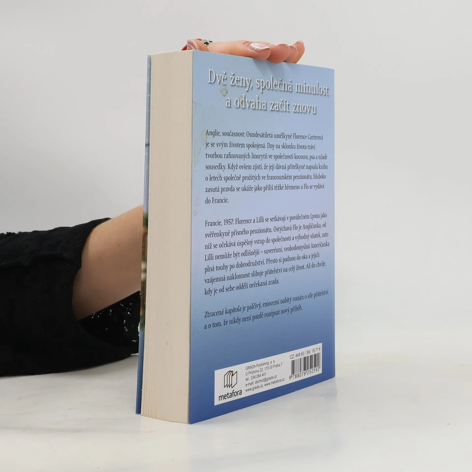 Anglie, současnost: Osmdesátiletá umělkyně Florence Carterová je se svým životem spokojená. Dny na sklonku života tráví tvorbou rafinovaných linorytů ve společnosti kocoura, psa a mladé sousedky Alice, tiché a úzkostné dívky. Když ovšem Flo zjistí, že její dávná ztracená přítelkyně vydala knihu o letech společně prožitých ve francouzském penzionátu, cítí povinnost odhalit roušku tajemství z minulosti a vydává se v doprovodu Alice a její matky do Francie. Po příjezdu do Lyonu se však hluboko zasutá pravda ukáže jako příliš těžké břemeno. Francie 1957: Florence a Lili se setkávají v poválečném Lyonu jako svěřenkyně přísně vedeného penzionátu pro dívky. Flo je ostýchavé děvče z Anglie, od něhož se očekává úspěšný vstup do společnosti a pak i výhodný sňatek. Lili je její pravý opak – suverénní Američanka se svobodnou duší, plná touhy po dobrodružství. Navzdory všemu se z dívek stanou nerozlučné kamarádky, jejichž vzájemná náklonnost slibuje přátelství na celý život… než je od sebe oddělí nečekaná zrada. Ztracená kapitola je palčivý, emocemi nabitý román o síle přátelství. Jeho poselstvím je zpráva, že nikdy není pozdě rozepsat nový příběh.