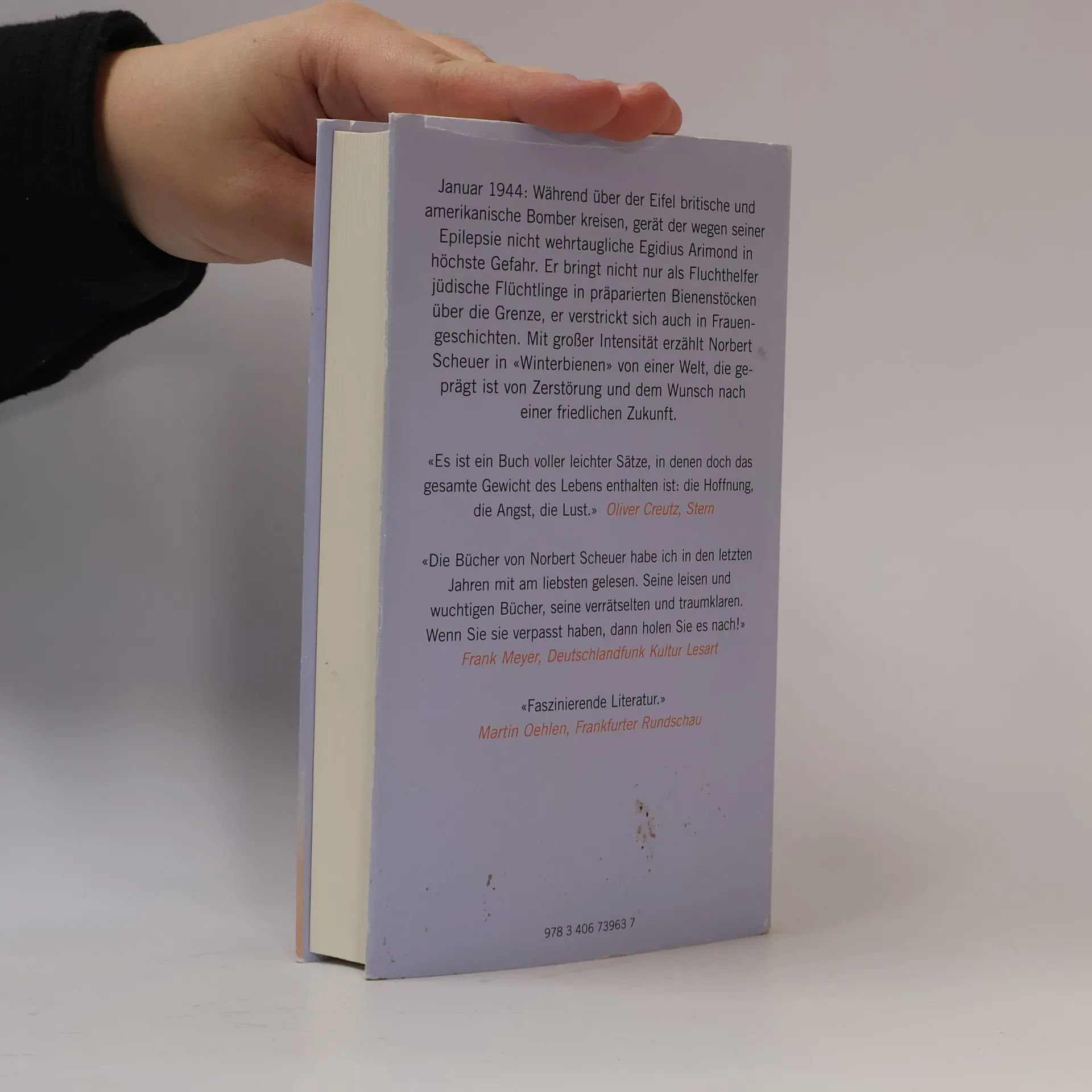 Januar 1944: Während über der Eifel britische und amerikanische Bomber kreisen, gerät der wegen seiner Epilepsie nicht wehrtaugliche Egidius Arimond in höchste Gefahr. Er bringt nicht nur als Fluchthelfer jüdische Flüchtlinge in präparierten Bienenstöcken über die Grenze, er verstrickt sich auch in Frauengeschichten. Mit großer Intensität erzählt Norbert Scheuer in „Winterbienen“ einfühlsam, präzise und spannend von einer Welt, die geprägt ist von Zerstörung und dem Wunsch nach einer friedlichen Zukunft.