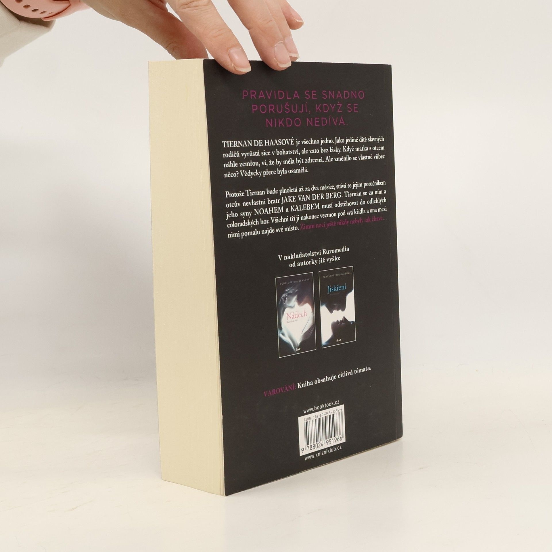 Tiernan de Haasové je všechno jedno. Jako jediné dítě slavných rodičů vyrůstá sice v bohatství, ale zato bez lásky. Když rodiče náhle zemřou, ví, že by měla být zdrcená. Ale změnilo se vlastně vůbec něco? Vždycky přece byla osamělá. Protože Tiernan bude plnoletá až za dva měsíce, stává se jejím poručníkem otcův nevlastní bratr Jake Van der Berg. Tiernan se za ním a jeho syny Noahem a Kalebem musí odstěhovat do odlehlých coloradských hor. Všichni tři ji nakonec vezmou pod svá křídla a ona mezi nimi pomalu najde své místo. Také si však uvědomí, že hranice se stírají a pravidla se snadno porušují, když se nikdo nedívá. Jeden z nich ji má. Druhý ji chce. Ale on… On si ji nechá.