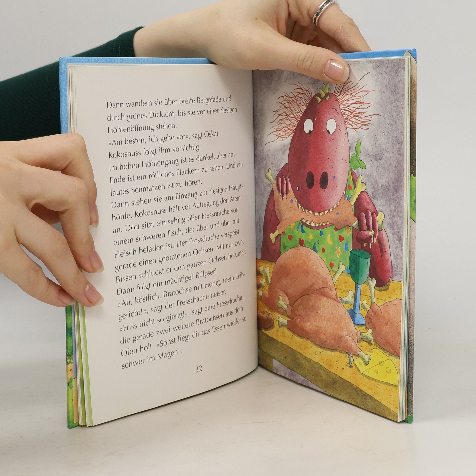 Der kleine Drache Kokosnuss ist furchtbar aufgeregt: Heute ist ein wichtiger Tag! Heute geht er zum ersten Mal in die Schule! Mit einer großen, bunten Schultüte in der kleinen Drachenhand und begleitet von Mama und Papa, folgt er den ABC-Schützen zu Lehrer Kornelius Kaktus. Unterwegs treffen sie Oskar, den jungen Fressdrachen. Neugierig beobachtet er das bunte Treiben. Er hat keine Schultüte, denn – und das ist bekannt – Fressdrachen gehen nicht zur Schule. Schließlich besteht die Gefahr, dass sie ihre Klassenkameraden auffressen!Eigentlich schade, findet Kokosnuss. Superschade, meint Oskar, denn er würde so wahnsinnig gerne Rechnen und Schreiben lernen ... Wie Oskar doch noch das Dracheneinmaleins lernt, Klassenbester im Schwimmen wird und mit einer waghalsigen Rettungsaktion beweist, dass Feuer- und Fressdrachen prima miteinander befreundet sein können, das erzählt das neue lustige und spannende Abenteuer vom kleinen Drachen Kokosnuss. Die Geschichten über die aufregenden Abenteuer, die der kleine Drache Kokosnuss und seine Freunde gemeinsam erleben, sind inzwischen wahre Kinderbuchklassiker. Ingo Siegner schreibt über Freundschaft und Mut und fügt liebenswert-originelle Illustrationen hinzu. Die »Dein-Spiegel-Bestseller«-Reihe eignet sich perfekt zum Vor- und Selberlesen. Ausstattung: Mit fbg. Illustrationen