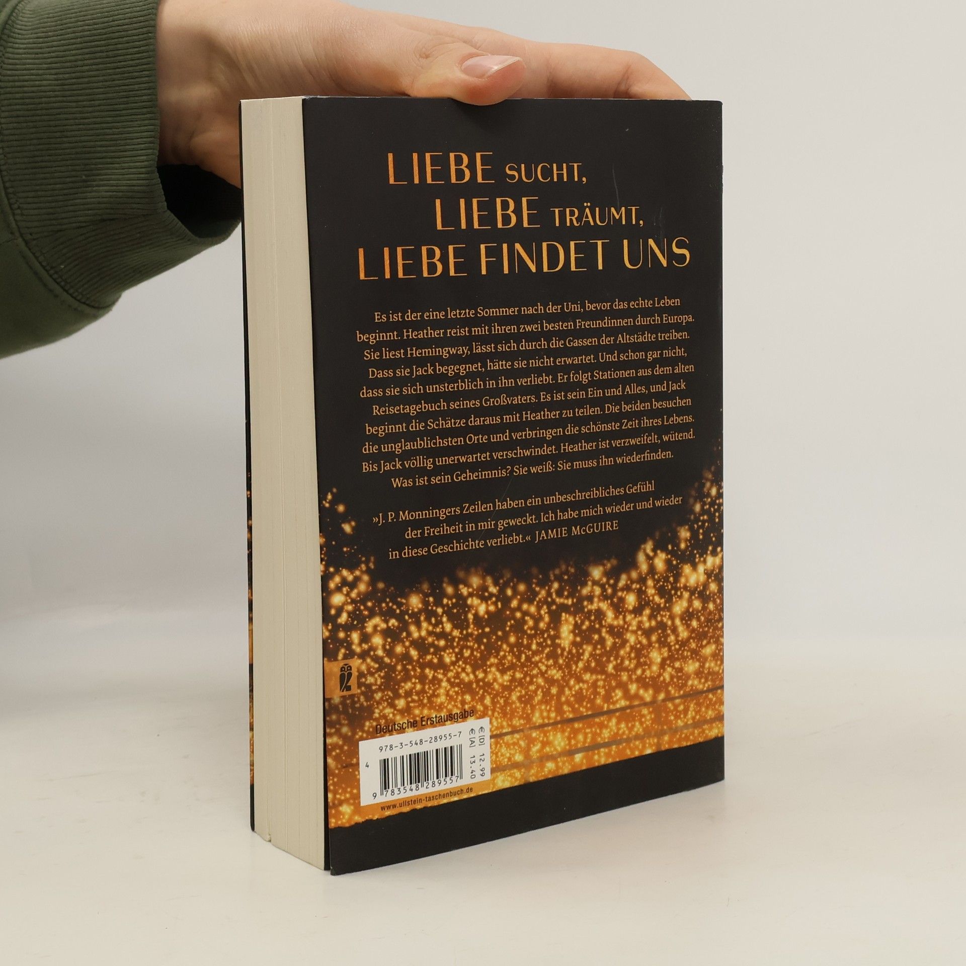 Liebe sucht, Liebe träumt, Liebe findet uns Es ist der eine letzte Sommer nach der Uni, bevor das echte Leben beginnt. Heather reist mit ihren zwei besten Freundinnen durch Europa. Sie liest Hemingway, lässt sich durch die Gassen der Altstädte treiben. Dass sie Jack begegnet, hätte sie nicht erwartet. Und schon gar nicht, dass sie sich unsterblich in ihn verliebt. Er folgt Stationen aus dem alten Reisetagebuch seines Großvaters. Es ist sein Ein und Alles, und Jack beginnt die Schätze daraus mit Heather zu teilen. Die beiden besuchen die unglaublichsten Orte und verbringen die schönste Zeit ihres Lebens. Bis Jack völlig unerwartet verschwindet. Heather ist verzweifelt, wütend. Was ist sein Geheimnis? Sie weiß: Sie muss ihn wiederfinden. »Romantisch und unvergesslich« – Nicholas Sparks »J. P. Monningers Zeilen haben ein unbeschreibliches Gefühl der Freiheit in mir geweckt. Ich habe mich wieder und wieder in diese Geschichte verliebt.« – Jamie McGuire