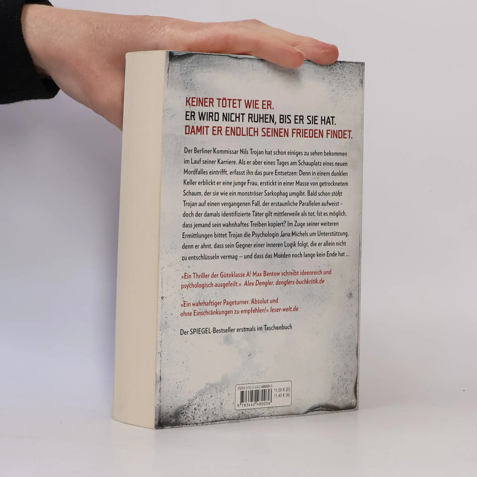 Keiner tötet wie er. Er wird nicht ruhen, bis er sie hat. Damit er endlich seinen Frieden findet Als der Berliner Kommissar Nils Trojan an den Schauplatz eines neuen Mordfalles gerufen wird, ist er zutiefst erschüttert von dem Anblick, der sich ihm bietet: Der Täter hatte eine junge Frau in den Keller gelockt und sie dort auf ungeahnte Weise ermordet – ihr Körper ist erstarrt in einem monströsen Sarkophag aus getrocknetem Schaum. Bei seiner Recherche stößt Trojan auf einen älteren Fall, der verblüffende Parallelen aufweist: Damals konnte die Puppenmacherin Josephin Maurer in letzter Sekunde aus einem Keller befreit werden, der Angreifer hatte bereits Spuren seiner makabren Handschrift auf ihrem Körper hinterlassen. Doch der als Täter identifizierte Karl Junker gilt inzwischen als tot – kann es sein, dass jemand ihn kopiert? Oder ist er doch noch am Leben, besessen davon, sein grausames Werk fortzusetzen?