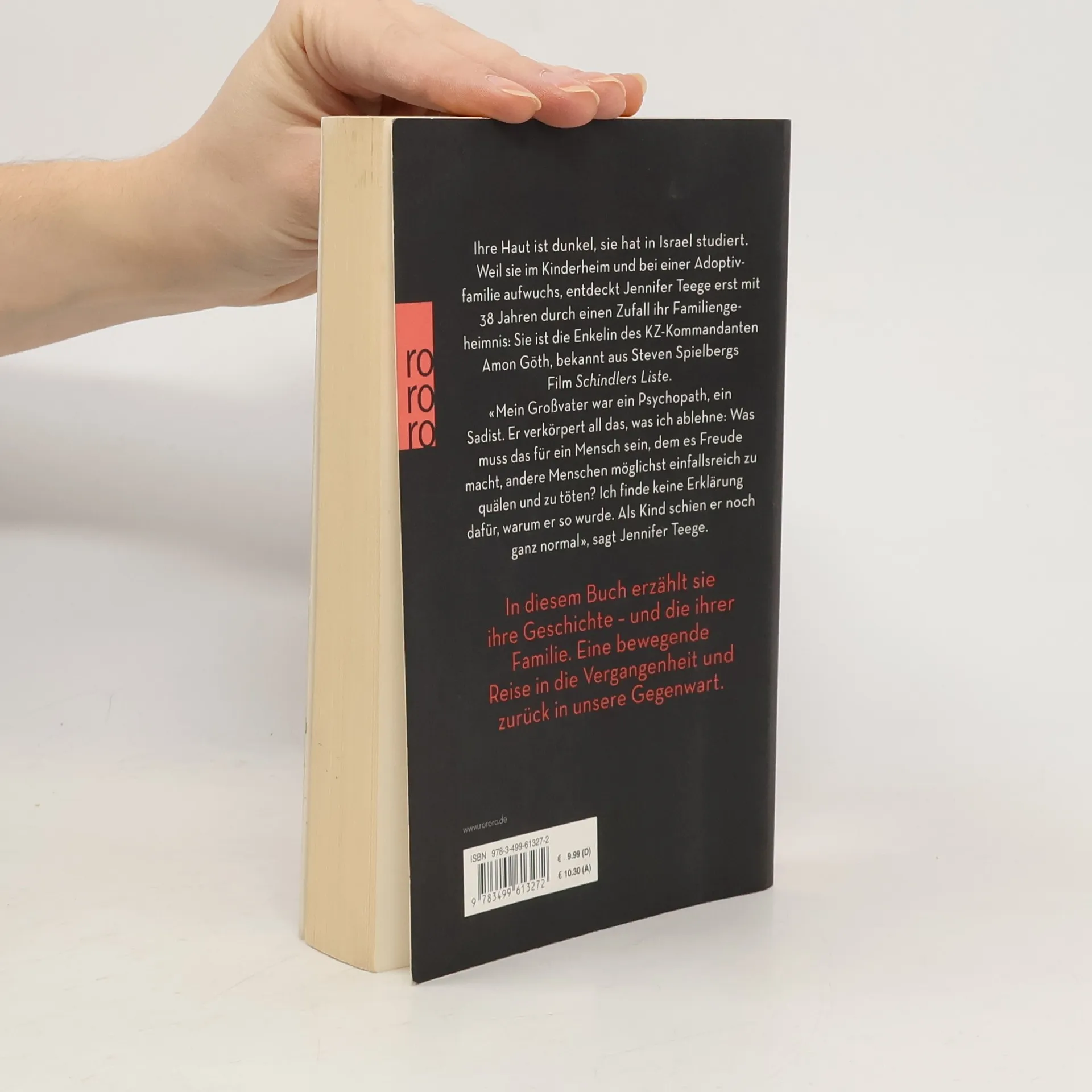 Es ist ein Schock, der ihr ganzes Selbstverständnis erschüttert: Mit 38 Jahren erfährt Jennifer Teege durch einen Zufall, wer sie ist. In einer Bibliothek findet sie ein Buch über ihre Mutter und ihren Großvater Amon Göth. Millionen Menschen kennen Göths Geschichte. In Steven Spielbergs Film «Schindlers Liste» ist der brutale KZ-Kommandant der Saufkumpan und Gegenspieler des Judenretters Oskar Schindler. Göth war verantwortlich für den Tod Tausender Menschen und wurde 1946 gehängt. Seine Lebensgefährtin Ruth Irene, Jennifer Teeges geliebte Großmutter, begeht 1983 Selbstmord. Jennifer Teege ist die Tochter einer Deutschen und eines Nigerianers. Sie wurde bei Adoptiveltern groß und hat danach in Israel studiert. Jetzt ist sie mit einem Familiengeheimnis konfrontiert, das sie nicht mehr ruhen lässt. Wie kann sie ihren jüdischen Freunden noch unter die Augen treten? Und was soll sie ihren eigenen Kindern erzählen? Jennifer Teege beschäftigt sich intensiv mit der Vergangenheit. Sie trifft ihre Mutter wieder, die sie viele Jahre nicht gesehen hat. Gemeinsam mit der Journalistin Nikola Sellmair recherchiert sie ihre Familiengeschichte, sucht die Orte der Vergangenheit noch einmal auf, reist nach Israel und nach Polen. Schritt für Schritt wird aus dem Schock über die Abgründe der eigenen Familie die Geschichte einer Befreiung.