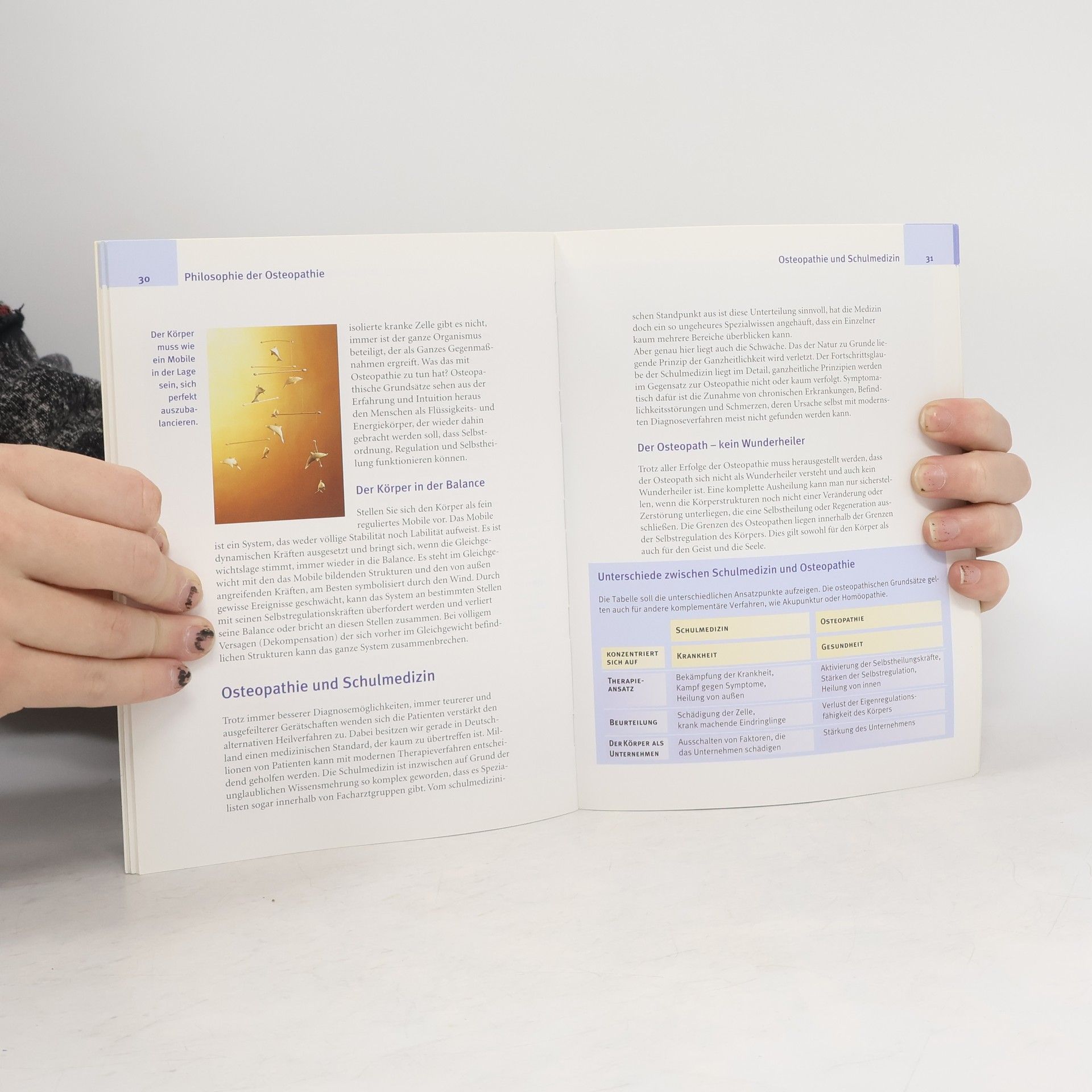 Alle Organe, Knochen und Muskeln sind wie in einem Netzwerk eng miteinander verknüpft. Solange ihr Zusammenspiel untereinander funktioniert, ist der Mensch gesund. Sobald aber die kleinste Einschränkung oder Verspannung entsteht, ist der Körper in seiner natürlichen Beweglichkeit eingeschränkt und erkrankt. Die Harmonie im Körper wieder herzustellen ist Aufgabe des Osteopathen. Mit sanften Handgriffen erspürt er die Barriere im Körpergewebe und löst sie durch leichten Druck. Dadurch werden die Selbstheilungskräfte des Körpers aktiviert, und die Energie im Körper kann fließen. Diese ganzheitliche, manuelle Therapie wurde vor ca. 130 Jahren in den USA entwickelt und ist heute dort fester Bestandteil der medizinischen Versorgung. Bei uns gilt die Osteopathie noch als Geheimtipp und wird von Ärzten, Heilpraktikern und Physiotherapeuten ausgeübt. Von Hexenschuss über Bandscheibenvorfall bis zu Migräne und Allergien - da nicht nur verkrampfte Muskeln und schmerzende Gelenke, sondern auch Organe beeinflusst werden, lassen sich alle Funktionsstörungen des Körpers mit Osteopathie behandeln. Erstmalig wird in einem Ratgeber ein Selbstbehandlungs-Programm angeboten, das es dem Patienten ermöglicht, kleinere Blockaden selbst zu erkennen und zu lösen.