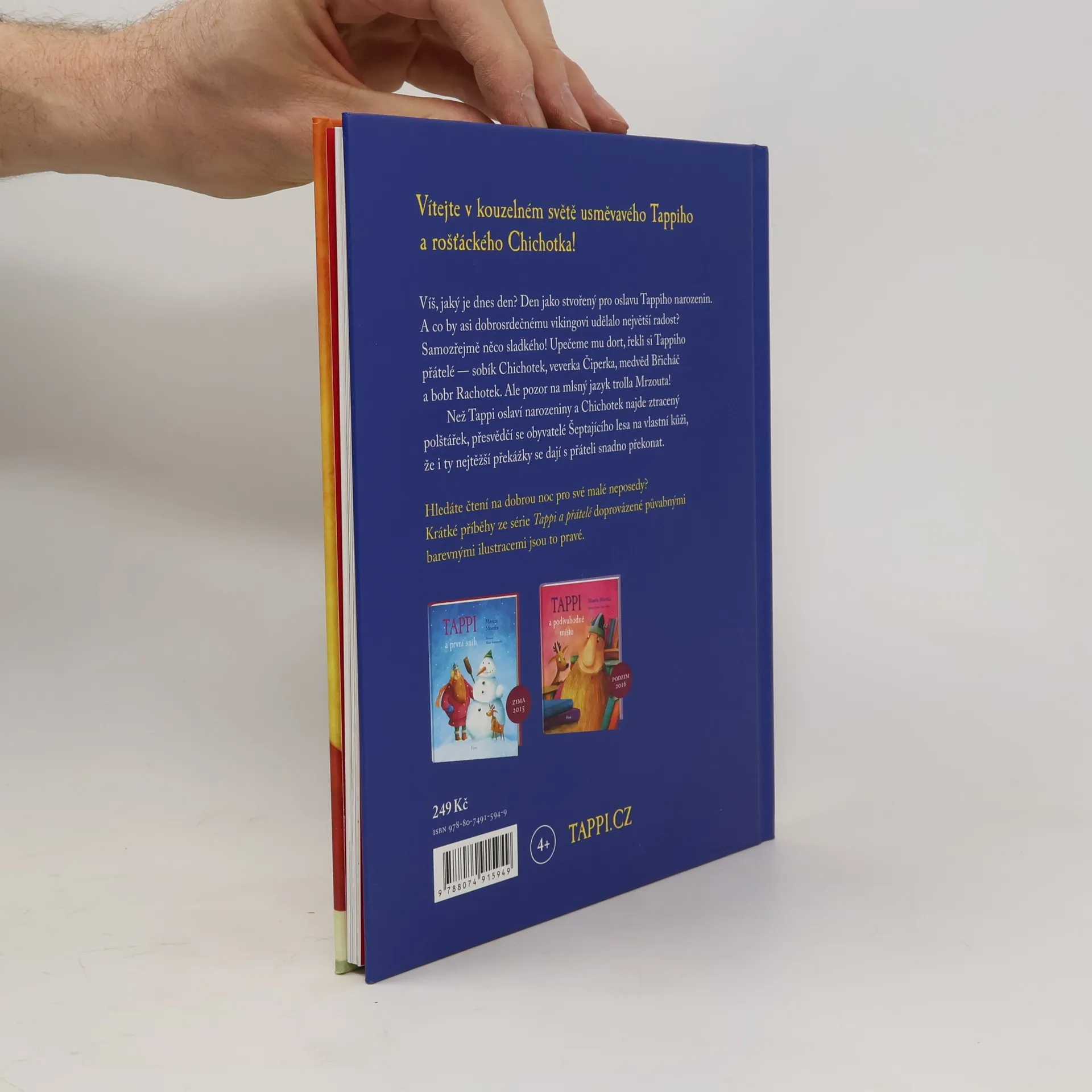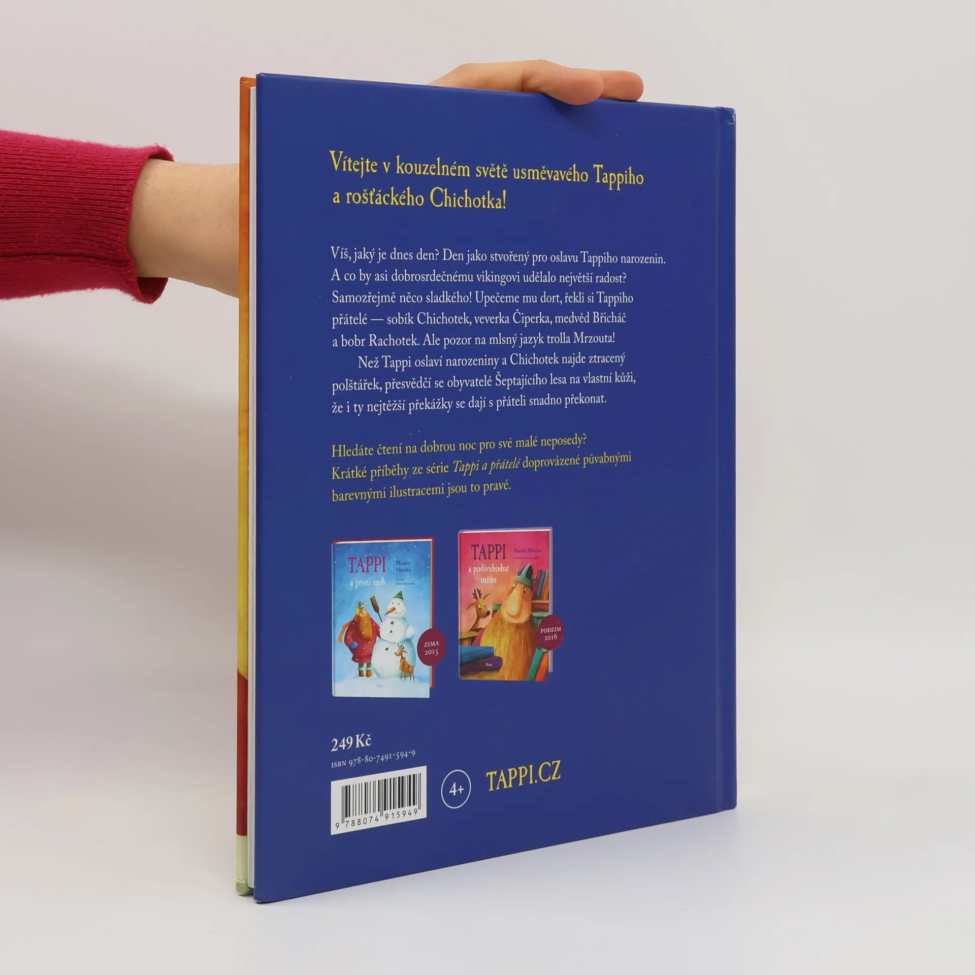 Druhý díl z nové série Tappi a přátelé. Vítejte v kouzelném světě usměvavého Tappiho a rošťáckého Chichotka! Víš, jaký je dnes den? Den jako stvořený pro oslavu Tappiho narozenin. A co by asi dobrosrdečnému vikingovi udělalo největší radost? Samozřejmě něco sladkého! Upečeme mu dort, řekli si Tappiho přátelé — sobík Chichotek, veverka Čiperka, medvěd Břicháč a bobr Rachotek. Ale pozor na mlsný jazyk trolla Mrzouta! Než Tappi oslaví narozeniny a Chichotek najde ztracený polštářek, přesvědčí se obyvatelé Šeptajícího lesa na vlastní kůži, že i ty nejtěžší překážky se dají s přáteli snadno překonat. Hledáte čtení na dobrou noc pro své malé neposedy? Krátké příběhy ze série Tappi a přátelé doprovázené půvabnými barevnými ilustracemi jsou to pravé.