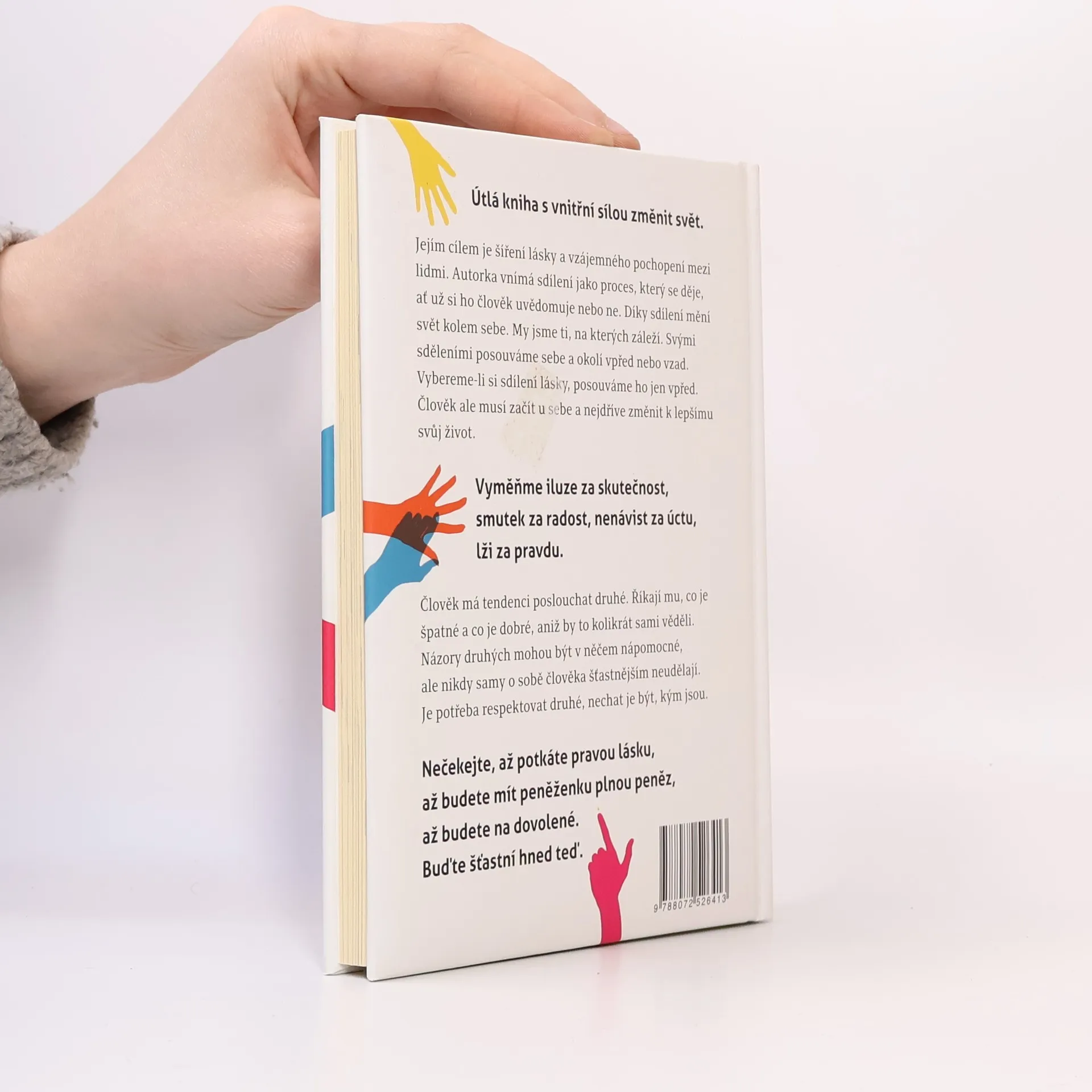 Útlá kniha s vnitřní sílou změnit svět. Jejím cílem je šíření lásky a vzájemného pochopení mezi lidmi. Autorka vnímá sdílení jako proces, který se děje, ať už si ho člověk uvědomuje nebo ne. Díky sdílení mění svět kolem sebe. My jsme ti, na kterých záleží. Svými sděleními posouváme sebe a okolí vpřed nebo vzad. Vybereme-li si sdílení lásky, posouváme ho jen vpřed. Člověk ale musí začít u sebe a nejdříve změnit k lepšímu svůj život. „Vyměňme iluze za skutečnost, smutek za radost, nenávist za úctu, lži za pravdu,“ radí autorka knihy Hana Marksová. „Nečekejte, až potkáte pravou lásku, až budete mít peněženku plnou peněz, až budete na dovolené. Buďte šťastní hned teď.“ V současné době vyhrocených emocí cítíme víc než kdy jindy potřebu šířit podobné pozitivní myšlenky, aby každý člověk měl svobodu vybrat si to, čemu bude věřit.