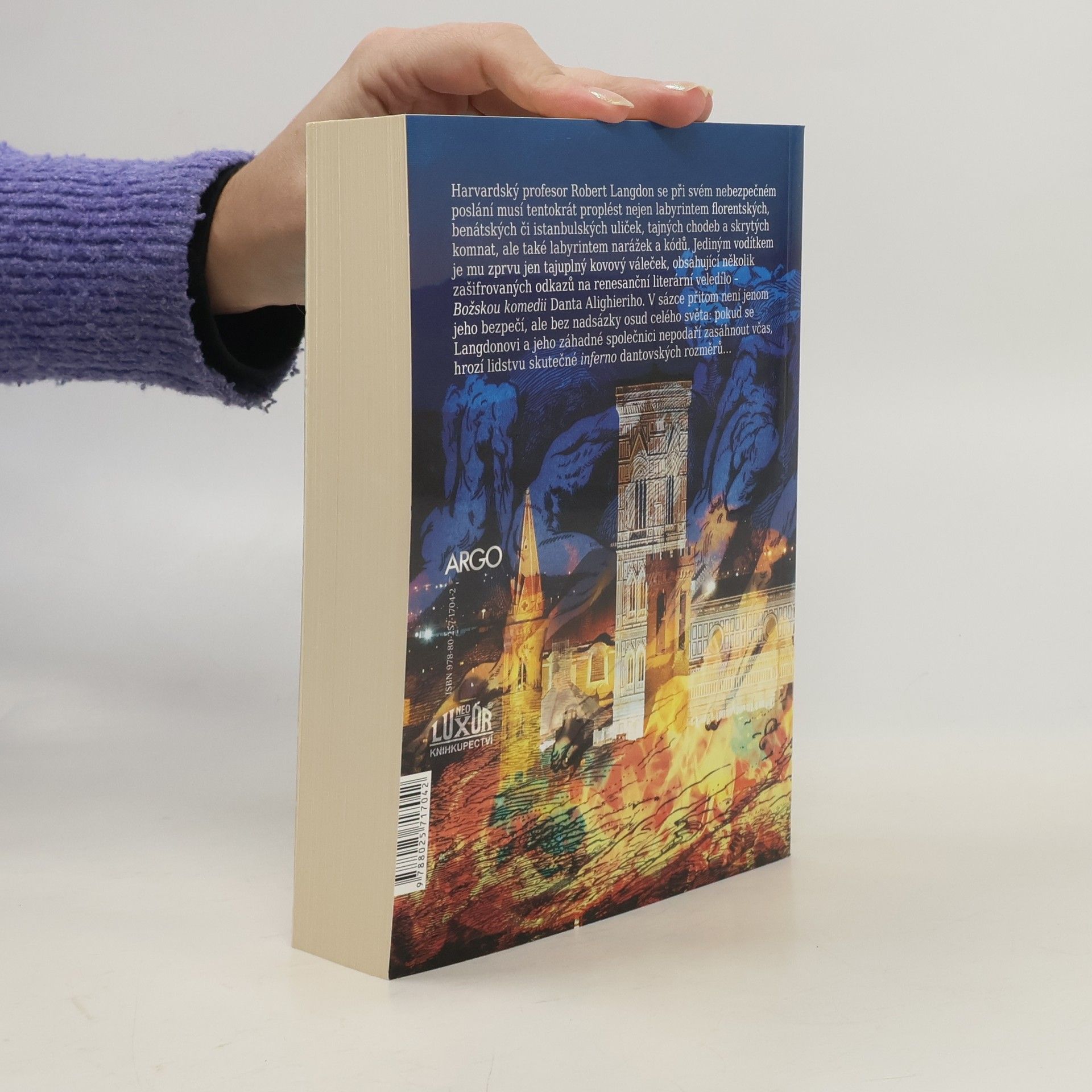 Harvardský profesor Robert Langdon se při svém nebezpečném poslání musí tentokrát proplést nejen labyrintem florentských, benátských či istambulských uliček, tajných chodeb a skrytých komnat, ale také labyrintem narážek a Kódů. Jediným vodítkem je mu zprvu jen tajuplný kovový váleček, obsahující několik zašifrovaných odkazů na renesanční literární veledílo- Božskou komedii Danta Alighieriho. V sázce přitom není jenom jeho bezpečí, ale bez nadsázky osud celého světa: pokud se Langdonovi a jeho záhadné společnici nepodaří zasáhnout včas, hrozí lidstvu skutečné inferno Dantových rozměrů...