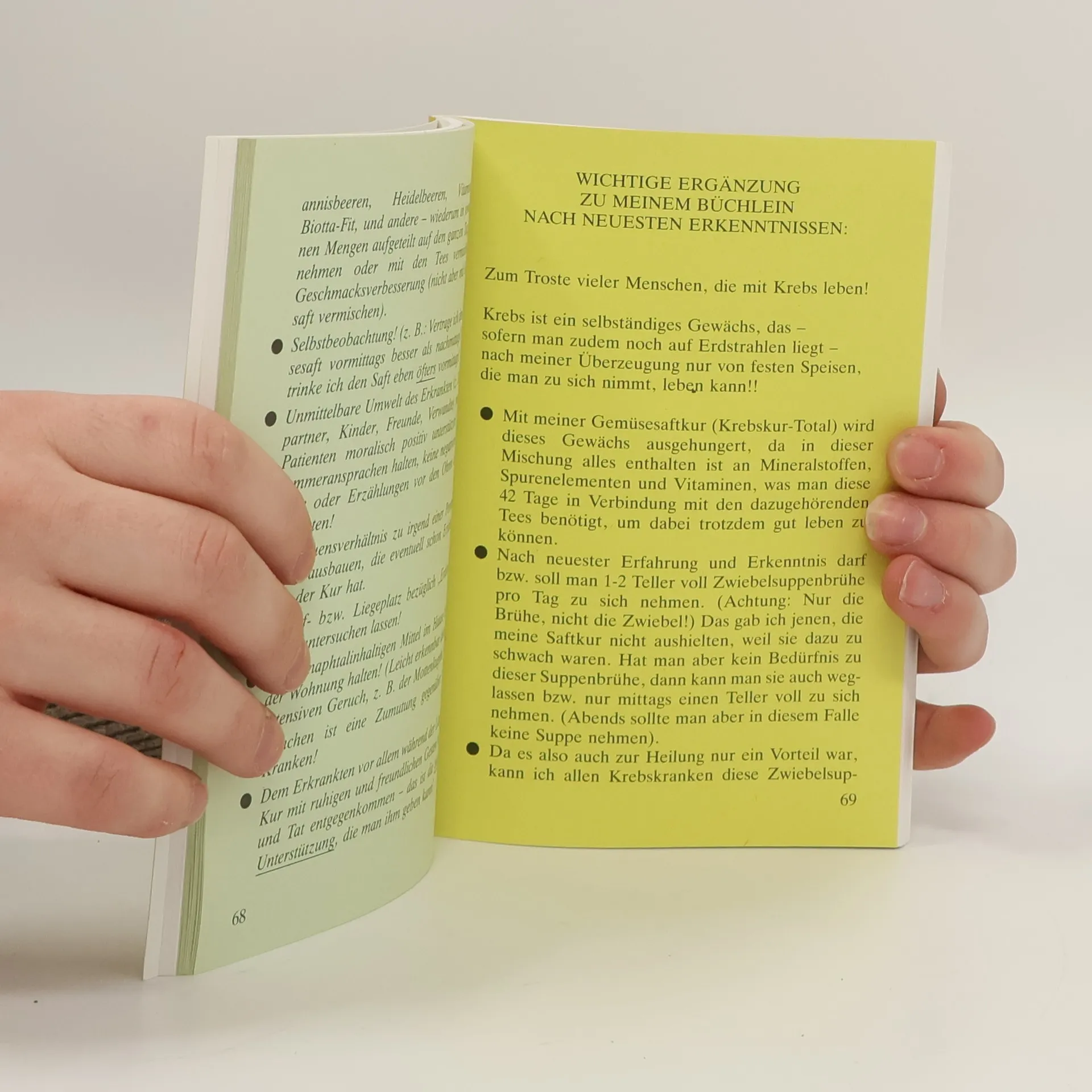 Unser Bestseller, das Buch von Rudolf Breuss „KREBS/Leukämie und andere scheinbar unheilbare Krankheiten mit natürlichen Mitteln heilbar“ wurde von ihm 1978 geschrieben und noch in seinem Todesjahr erweitert und verbessert. Wir haben das Werk seit seinem Tode im Jahre 1990 inhaltlich bewußt nicht geändert und komplett so belassen, wie es der Heilkundige seinerzeit herausgab. Neben Krebs und Leukämie befaßt sich Rudolf Breuß mit einer ganzen Reihe von Krankheiten und gibt wertvolle Ratschläge. Kernpunkt ist aber sein Kampf gegen den Krebs. Seine Therapie bezeichnet er auch als Operation ohne Messer und beschreibt seine Krebskur ausführlich. Beim Fasten löst der Körper alles auf, was körperfremd ist, das heißt, was nicht in den Körper hineingehört. Auf diese, der Naturheilkunde bekannte Tatsache, beruft sich der österreichische erfahrene Naturheilkundige Rudolf Breuß bei seiner „Krebskur total“: „Die Krebsgeschwulst ist ein selbständiges Gewächs und diese Zellen können nur durch Aushungern mit der Saftkur aufgezehrt werden.“ Rudolf Breuß hat für seine 42tägige Fastenkur ein Saftgemisch zusammengestellt, welches in der Hauptsache aus Roten Rüben, aus Möhren, Sellerieknollen, Rettich und Kartoffeln besteht, dazu kommen spezielle Teemischungen. Mit dieser Saftkur konnte Rudolf Breuß seit 1950 vielen nicht mehr operierbaren, von Ärzten aufgegebenen Krebskranken zur Gesundheit verhelfen. 164 Seiten