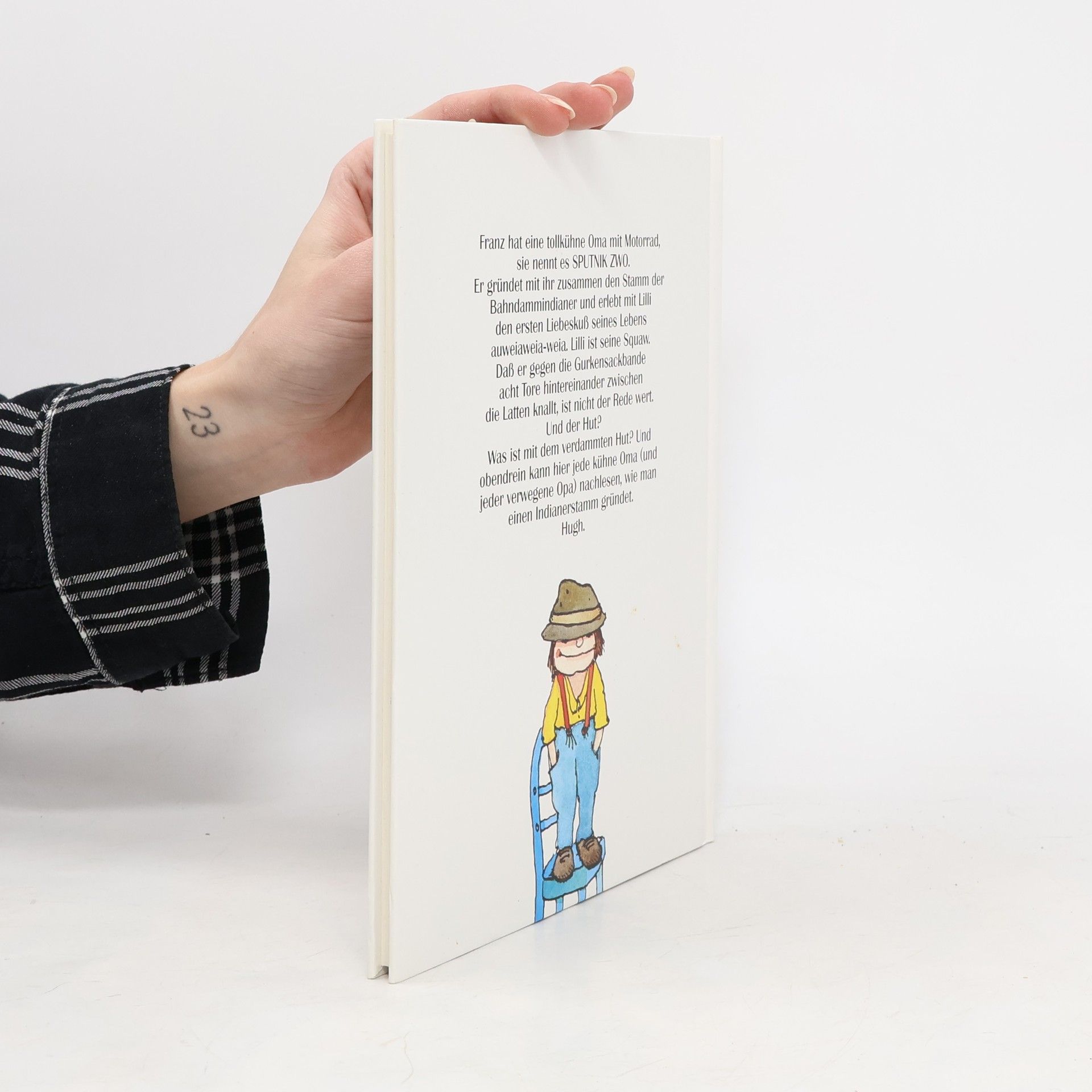 Franz hat eine tollkühne Oma mit Motorrad, sie nennt es SPUTNIK ZWO. Er gründet mit ihr zusammen den Stamm der Bahndammindianer und erlebt mit Lilli den ersten Liebeskuss seines Lebens auweiaweia-weia. Lilli ist seine Squaw. Das er gegen die Gurkensackbande acht Tore hintereinander zwischen die Latten knallt, ist nicht der Rede wert. Und der Hut? Was ist mit dem verdammten Hut? Und obendrein kann hier jede kühne Oma (und jeder verweigene Opa) nachlesen, wie man einen Indianerstamm gründet. Hugh.