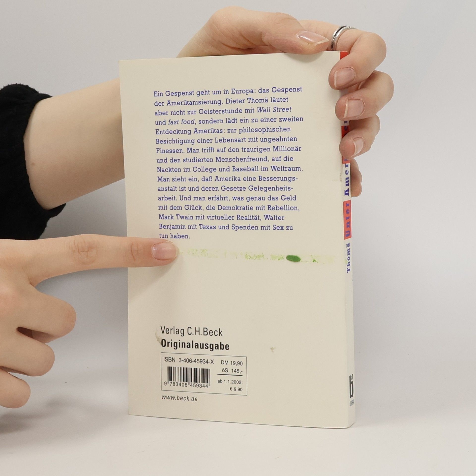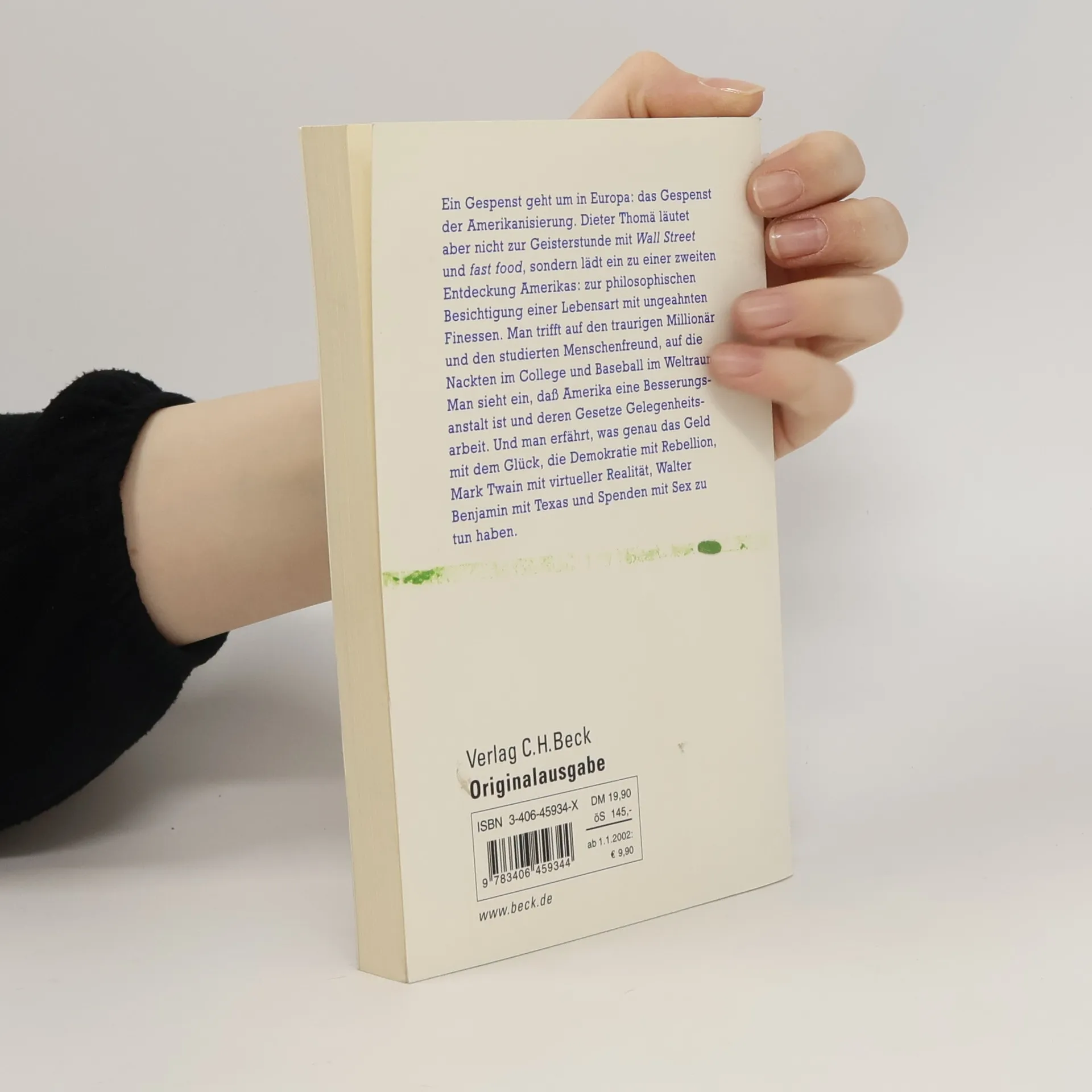 Ein Gespenst geht um in Europa: das Gespenst der Amerikanisierung. Dieter Thomä läutet aber nicht zur Geisterstunde mit Wall Street und fast food, sondern lädt ein zu einer zweiten Entdeckung Amerikas: zur Besichtigung einer Lebensart mit ungeahnten Finessen. Man trifft auf den Millionär als Trittbrettfahrer und den studierten Menschenfreund, auf die Nackten im College und Baseball im Weltraum. Man sieht ein, daß Amerika eine Besserungsanstalt ist und deren Gesetze Gelegenheitsarbeit. Und man erfährt, was genau das Geld mit dem Glück, die Demokratie mit der Toilettenspülung, Mark Twain mit virtueller Realität und Spenden mit Sex zu tun haben. (Quelle: chbeck.de).