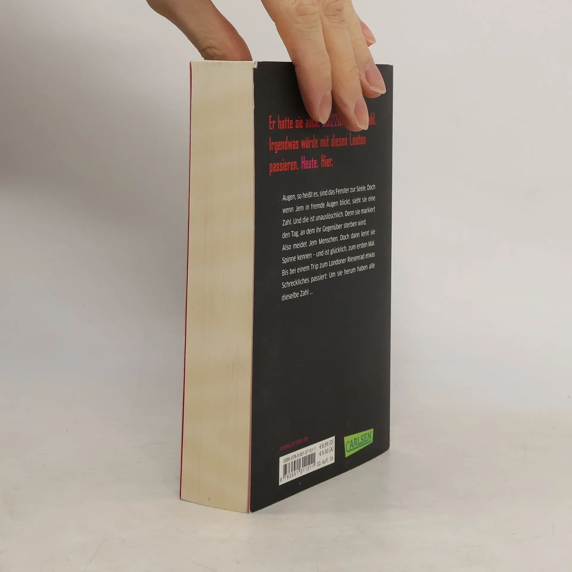 Wenn Jem in fremde Augen blickt, sieht sie eine Zahl. Genauer gesagt: ein Datum. Das Datum, an dem ihr Gegenüber sterben wird. Seit Jem das weiß, ist sie am liebsten allein. Bis sie Spinne kennenlernt – und mit ihm das Leben. Sie ist glücklich, zum ersten Mal. Doch als die beiden zum London Eye, dem Riesenrad, fahren, passiert es: Um sie herum tragen alle dieselbe Zahl. Jem weiß: Etwas Furchtbares wird passieren. Heute. Hier. Fluchtartig verlassen Spinne und sie das Gelände – und werden zu Gejagten … Ein atemberaubender Thriller mit Tiefgang, nominiert für den Jugendliteraturpreis
