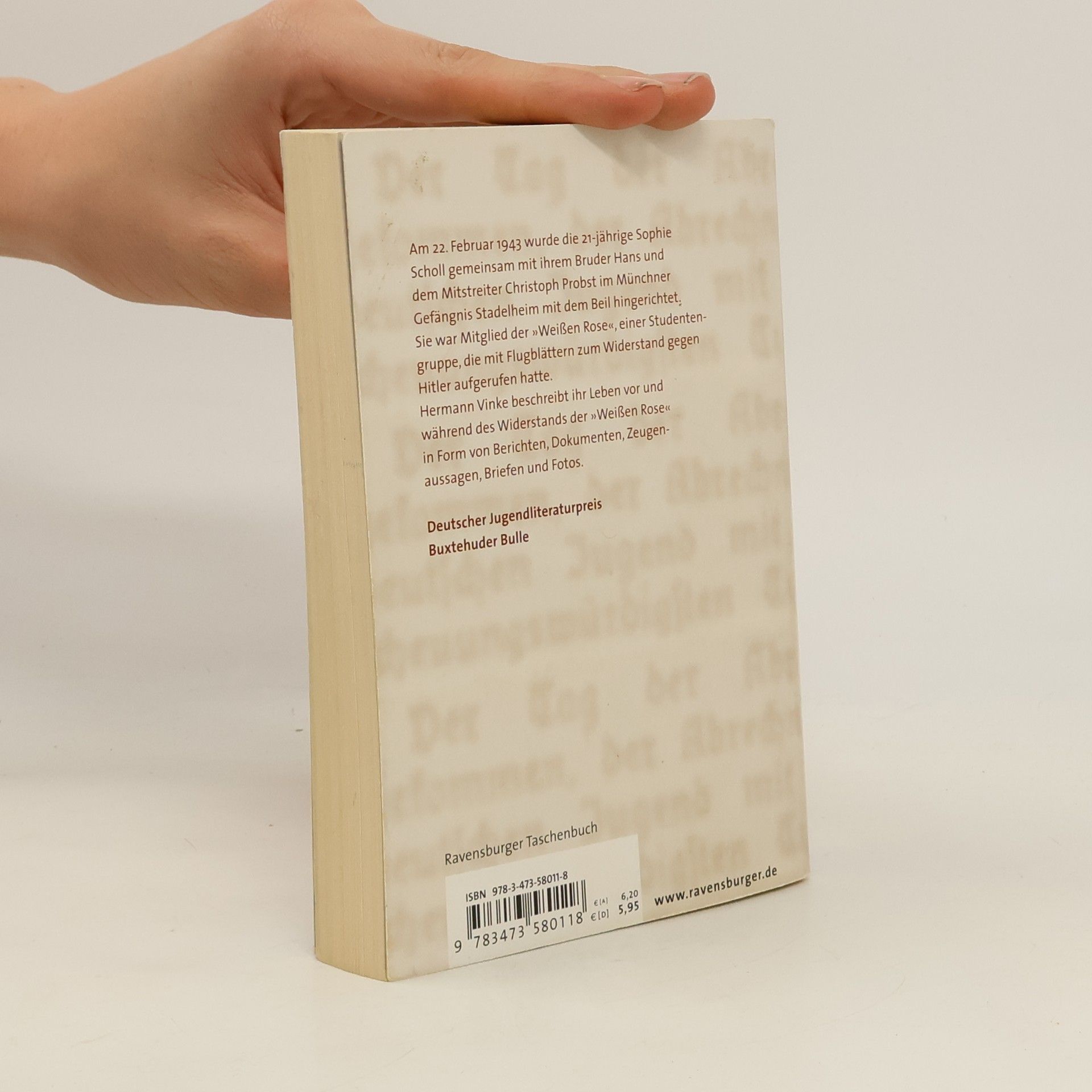 Am 22. Februar 1943 wurde die einundzwanzigjährige Sophie Scholl gemeinsam mit ihrem Bruder Hans und dem Mitstreiter Christoph Probst im Münchner Gefängnis Stadelheim hingerichtet. Sie war Mitglied der „Weißen Rose“, einer Studentengruppe, die mit Flugblättern zum Widerstand gegen Hitler aufgerufen hatte. Hermann Vinke beschreibt ihr Leben vor und während des Widerstands der „Weißen Rose“ in Form von Berichten, Dokumenten, Zeugenaussagen, Briefen und Fotos. Ein seltenes und erschütterndes Dokument über ein mutiges Mädchen in einer unheilvollen Zeit: Sophie Scholl interessierte sich kaum für politische Fragen, wurde aber aufgrund ihres nazikritischen Elternhauses trotzdem zur Widerstandskämpferin. In einer menschenfeindlichen Gesellschaft kämpfte sie mit großem Mut und Einsatz für ihre eigenen Ansichten und Ziele. Dadurch wurde sie zu einem unvergessenen Vorbild, auch für Jugendliche der heutigen Zeit. Hermann Vinke beschreibt das Leben dieser außergewöhnlichen jungen Frau, indem er ihre eigenen Aufzeichnungen mit Erinnerungen und Auszügen aus Briefen sowie dem historischen Hintergrund des Nationalsozialismus kombiniert.