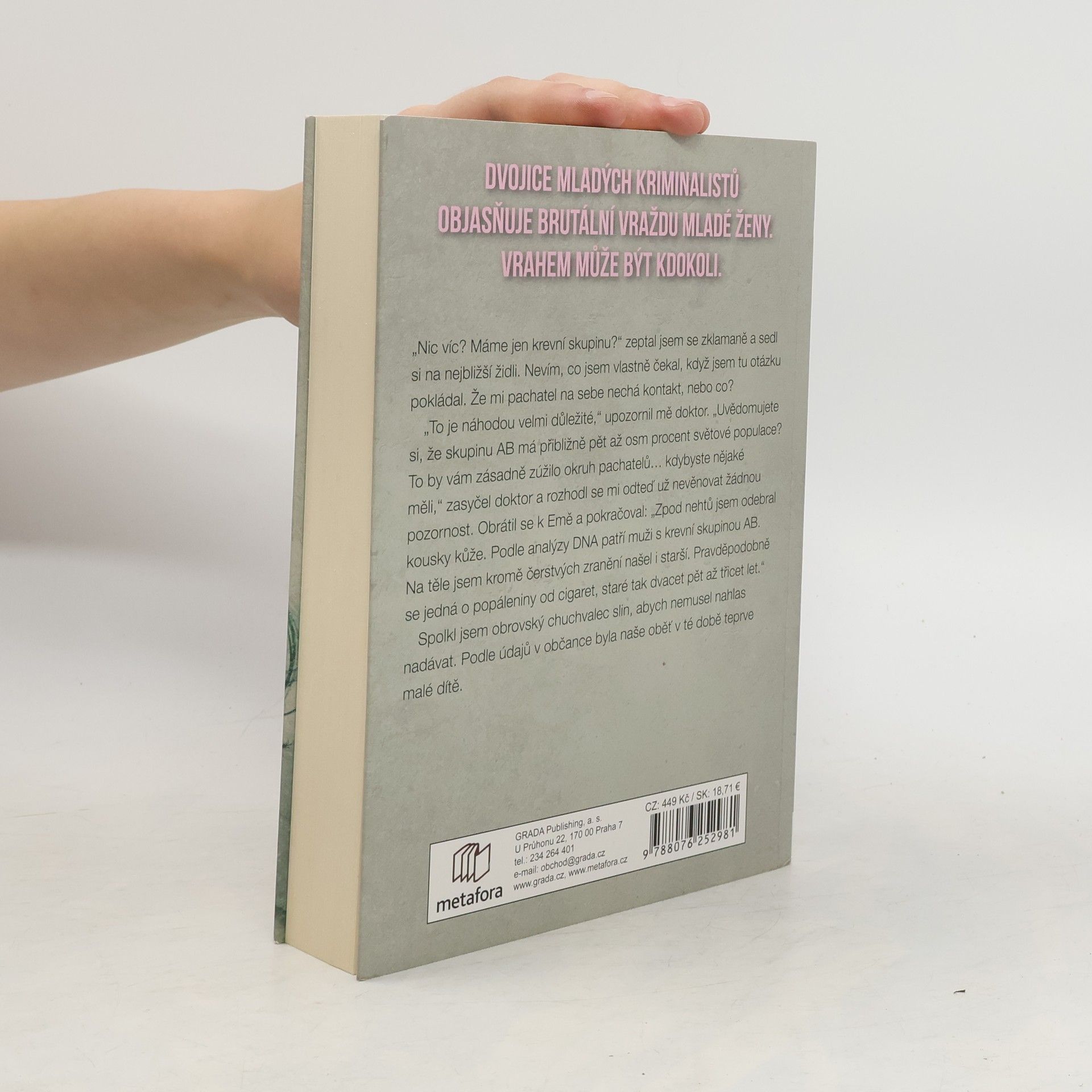 V bohem zapomenuté chatové osadě na východním Slovensku nacházejí dva mladíci zavražděnou ženu. Její totožnost je velkou neznámou. Případ řeší svérázný detektiv David Meizner, věčně nevrlý a nepříjemný sukničkář, který nemá lidi příliš v lásce, a jeho krásná a věcná kolegyně Ema Kopecká. Aby odhalili totožnost vraha, musejí se společně prodrat pavučinou utkanou z dávných tajemství. Jejich pátrání se však komplikuje…Drama plné zvratů a nečekaných událostí se hemží podezřelými postavami z minulosti i současnosti, dávno zapomenutými hříchy, ale i bolestí a utrpením, které musela malá holčička a později mladá žena prožít. Děj nás postupně zavede do malé vesničky pod Tatrami, aby pokračoval do hlavního města a zpět na místo, kde měla hlavní hrdinka nečekanou schůzku se smrtí. Příběh rozehraný postavami z masa a krve je napínavý až do samotného konce a překvapí nečekaným rozuzlením.Vychází v překladu Ľubici Hricoviniové.