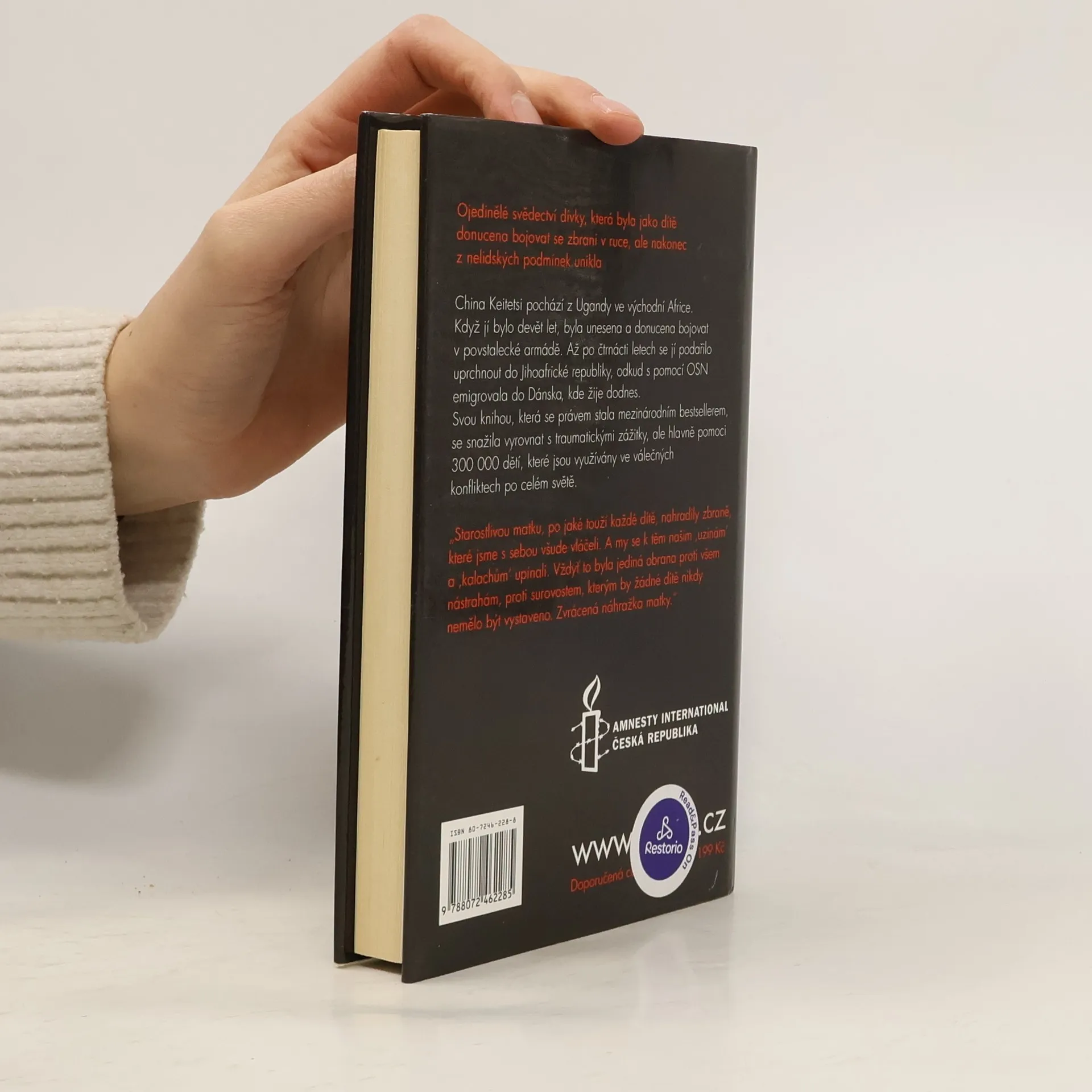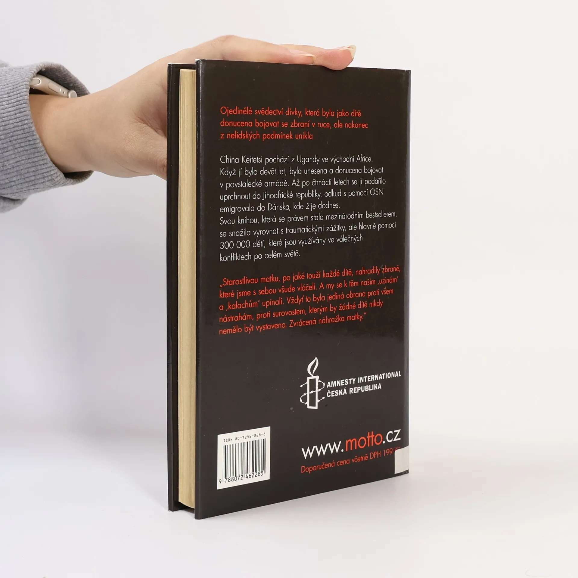 Podtitulkem knihy je: Místo panenky mi dali pušku. V knize autorka popisuje k čemu byla po léta nucena. O tom jak byla trápena, bita a znásilňována. Přibližuje ukrutnosti, které musejí dětští vojáci provádět i snášet. Ojedinělé svědectví dívky, která byla jako dítě donucena bojovat se zbraní v ruce, ale nakonec z nelidských podmínek unikla. China Keitetsi pochází z Ugandy ve východní Africe. Když jí bylo devět let, byla unesena a donucena bojovat v povstalecké armádě. Až po čtrnácti letech se jí podařilo uprchnout do Jihoafrické republiky, odkud s pomocí OSN emigrovala do Dánska, kde žije dodnes. Svou knihou, která se právem stala mezinárodním bestsellerem, se snažila vyrovnat se svými traumatickými zážitky, ale hlavně pomoci 300 000 dětí, které jsou využívány ve válečných konfliktech po celém světě.
