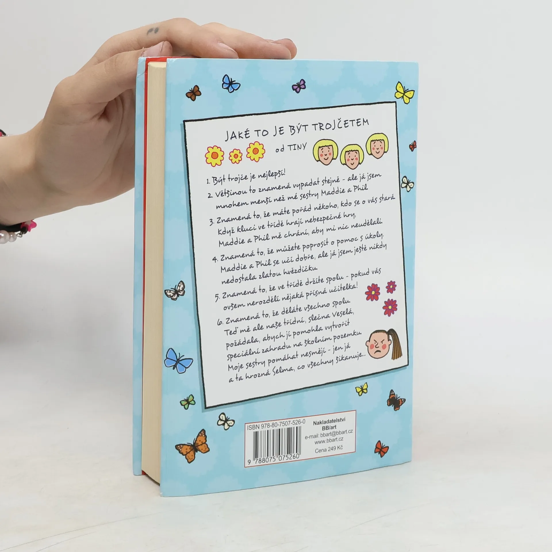 Tina, jako trojče, se od svých sester Phil a Maddie liší téměř ve všem, včetně toho, že v ničem není tak dobrá jako ony. Naštěstí se o Tinu starají a pomáhají jí, dokud je nová učitelka, slečna Veselá, neoddělí. Tina je zděšena, když ji posadí vedle zlé Selmy, ale brzy zjistí, že Selma je mnohem zajímavější, než se zdá. Být trojče znamená mít někoho, kdo se o vás stará, a Tina se spoléhá na Maddie a Phil, aby ji chránily před nebezpečnými hrami kluků ve třídě. Také to znamená, že může žádat o pomoc s úkoly, protože její sestry se učí dobře, zatímco ona nikdy nezískala zlatou hvězdičku. Když je však oddělena od svých sester, musí se postavit novým výzvám. Učitelka ji požádá, aby pomohla vytvořit speciální zahradu na školním pozemku, a to pouze s Selmou, která je známá svým šikanováním. Tento příběh o přátelství, důvěře a o tom, jak je někdy těžké být sám sebou, je určen čtenářkám ve věku od sedmi do devíti let a přináší poselství o překonávání překážek a objevování vlastních sil.