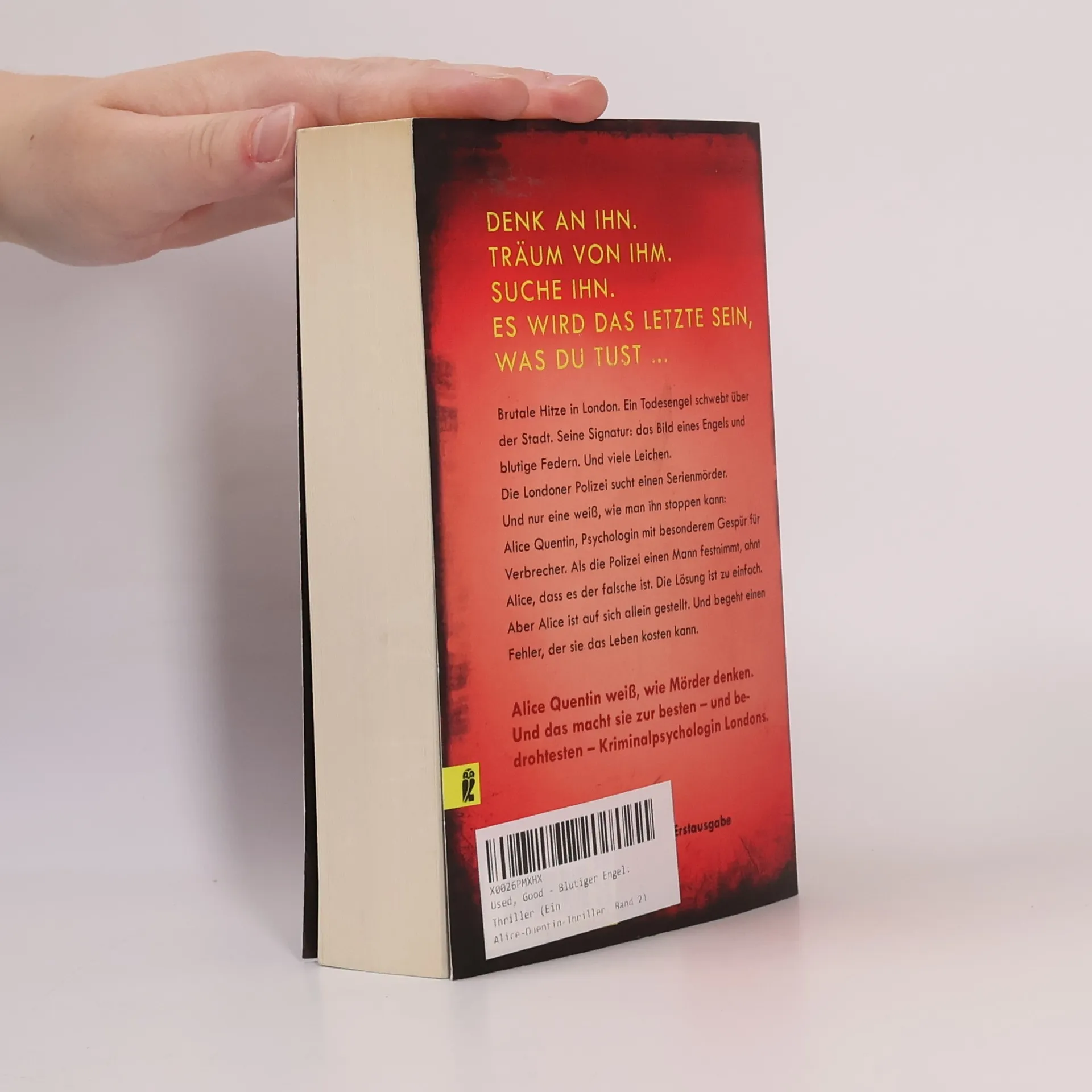 Brutale Hitze in London. Ein Todesengel schwebt über der Stadt. Seine Signatur: das Bild eines Engels und blutige Federn. Die Londoner Polizei sucht einen Serienmörder. Und nur eine weiß, wie man ihn stoppen kann: Alice Quentin, Psychologin mit besonderem Gespür für Verbrecher. Als die Polizei einen Mann festnimmt, ahnt Alice, dass es der Falsche ist. Die Lösung ist zu einfach. Alice ist auf sich allein gestellt. Und begeht einen Fehler, der sie das Leben kosten kann.